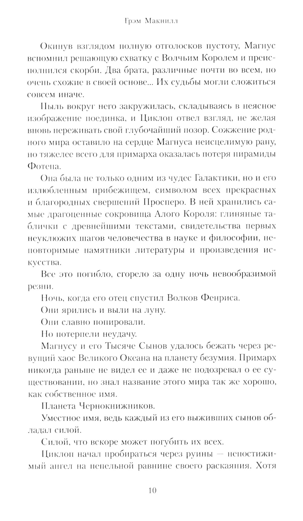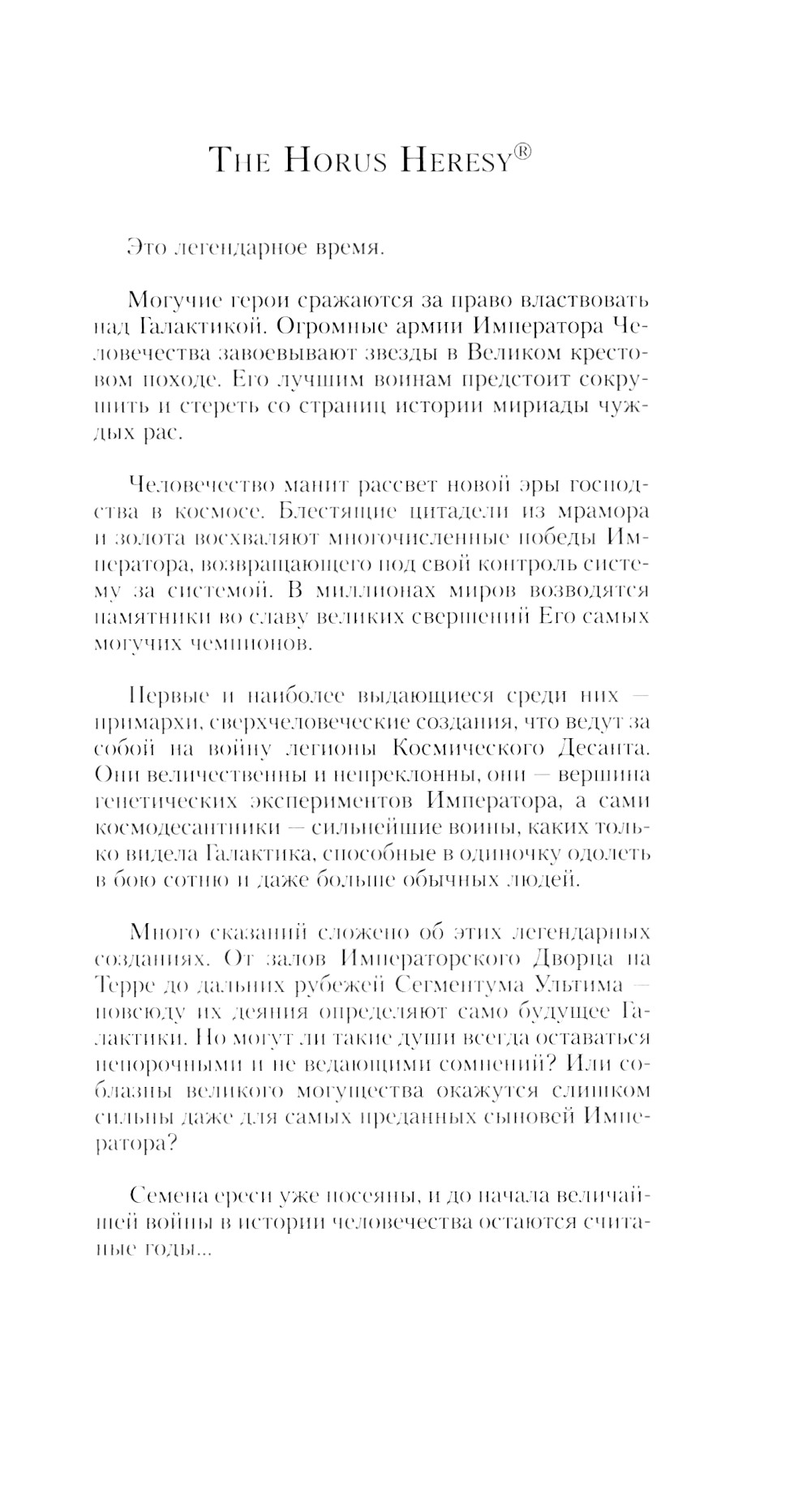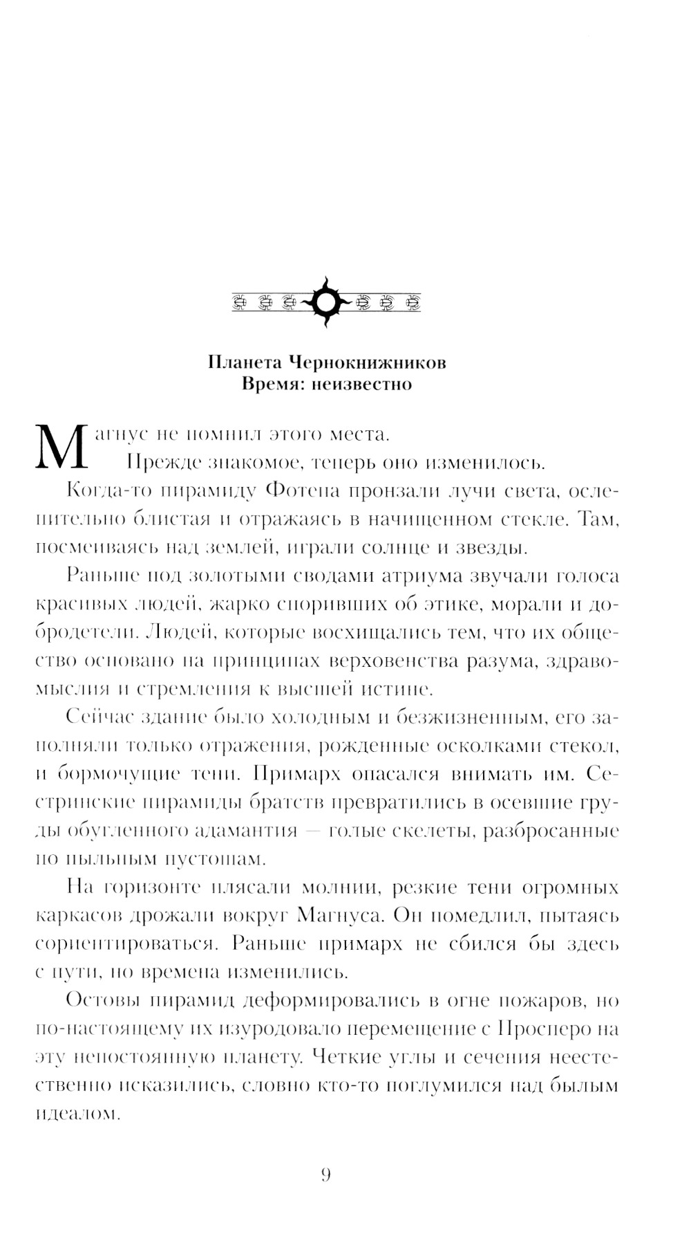 Магнус Красный, таинственный оккультный владыка, долго изучал древнее искусство чернокнижия. Теперь псайкер, сравниться с коим может один лишь Император, командует верным ему легионом Тысячи Сынов в Великом крестовом походе, разыскивая по пути утраченные знания на руинах погибших человеческих цивилизаций. Сражаясь вместе со своим братом, Пертурабо из Железных Воинов, Магнус предчувствует близящуюся развилку судьбы - продолжит ли Циклоп биться во имя общих целей или направит усилия на дальнейшее познание варпа?| Издательство | Изд. Фантастика Книжный Клуб |