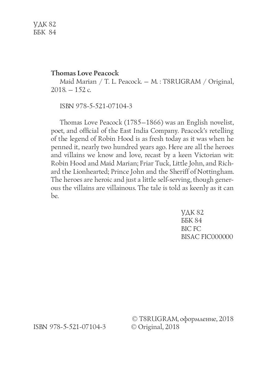 Thomas Love Peacock (1785-1866) was an English novelist, poet, and official of the East India Company. Peacock's retelling of the legend of Robin Hood is as fresh today as it was when he penned it, nearly two hundred years ago. Here are all the heroes and villains we know and love, recast by a keen Victorian wit Robin Hood and Maid Marian; Friar Tuck, Little John, and Richard the Lionhearted; Prince John and the Sheriff of Nottingham. The heroes are heroic and just a little self-serving, though generous the villains are villainous. The tale is told as keenly as it can be.| Издательство | Т8 RUGRAM |