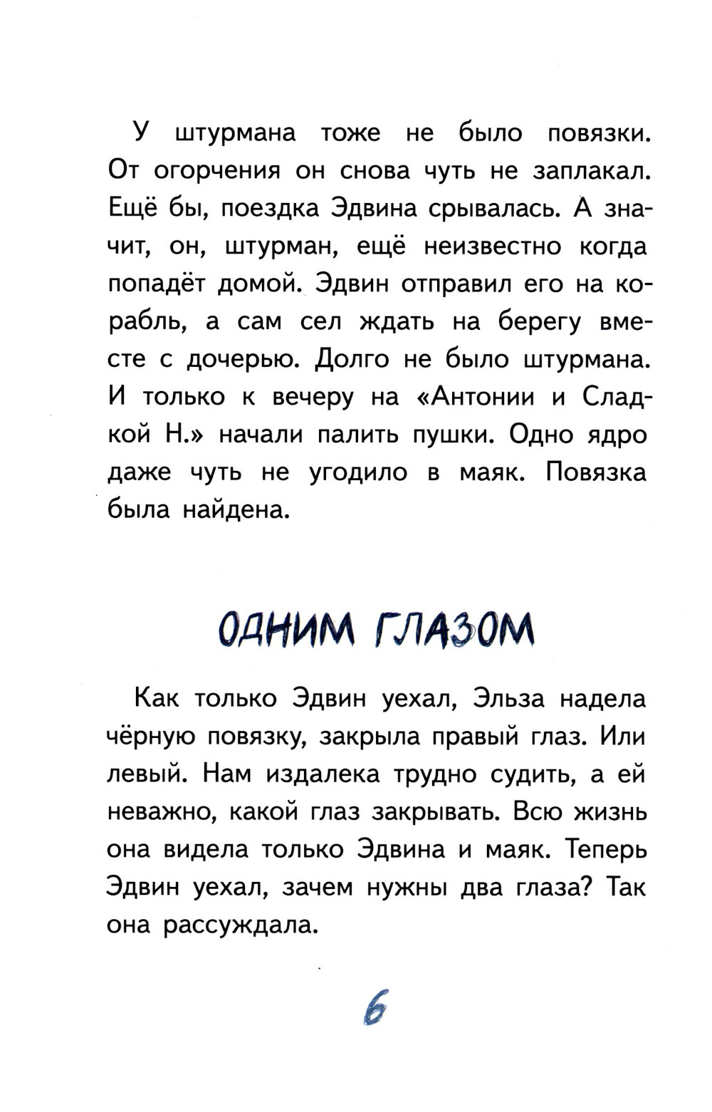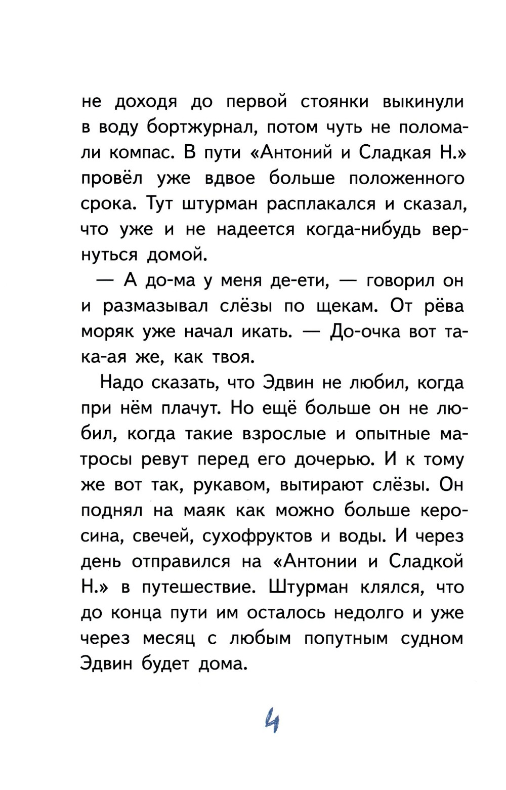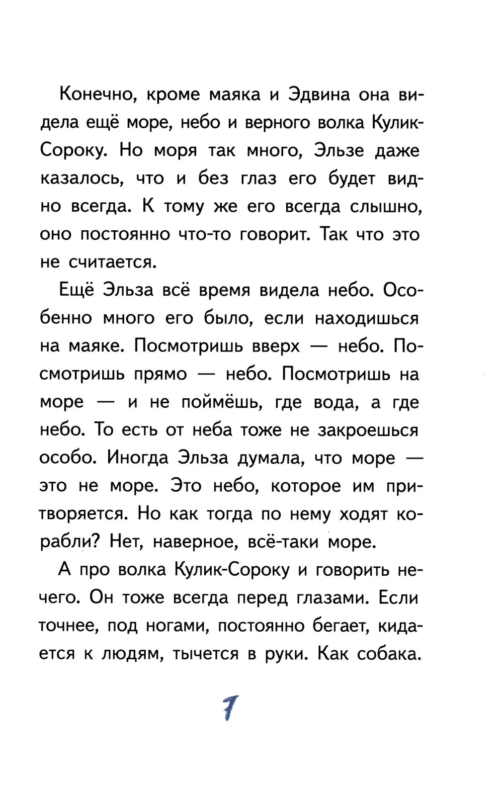 Маяк стоит у моря. Обычное дело, скажете вы. Но маяк, где живут рыжий Эдвин и Эльза, не просто у моря - он почти на самом краю света. И когда Эдвин вдруг отправляется в плавание, Эльза остаётся на далёком северном берегу совсем одна. Ладно, не совсем: с ней волк по кличке Кулик-Сорока и некий Капоряк в бутылке. Капоряк в бутылке - не игрушка или статуя, это просто старый знакомый Эдвина, посылающий письма бутылочной почтой. А рыжий Эдвин? Он в пути, волны за бортом бушуют. Он говорит с кораблём по имени «Антоний и Сладкая Н.». Даже вступает в сговор с ними. С кем это «с ними»? С Антонием и Сладкой Н., конечно: он просит их помочь ему в одном исключительно важном деле. (Спойлер: они обязательно помогут, а вы всё равно удивитесь.) В сказке Марии Ботевой удивительно всё: и жизнь героев, и стиль повествования, и цепочка сюжетных поворотов. Читателя ждёт увлекательное путешествие по открытому морю, с обязательными туманом и штормом - а разве бывает плавание без шторма? Но сквозь мглу и брызги то и дело проглядывает огонёк - мерцающий, слабый: кажется, этот маяк давным-давно не закрывали на ремонт. Но он нужен героям книги - и развалиться на кусочки просто не может, несмотря на все бури и ненастья. Мария Ботева - автор многих популярных книг, лауреат множества премий, а несколько её произведений включены в список выдающихся детских книг мира «Белые вороны». При всей лёгкости проза Марии Ботевой отличается богатством эмоциональных красок, непредсказуемостью и глубиной. Стиль писательницы, что называется, неподражаем: это действительно уникальный язык, который каждый читатель, однажды узнав, полюбит.| Издательство | ИД КомпасГид |