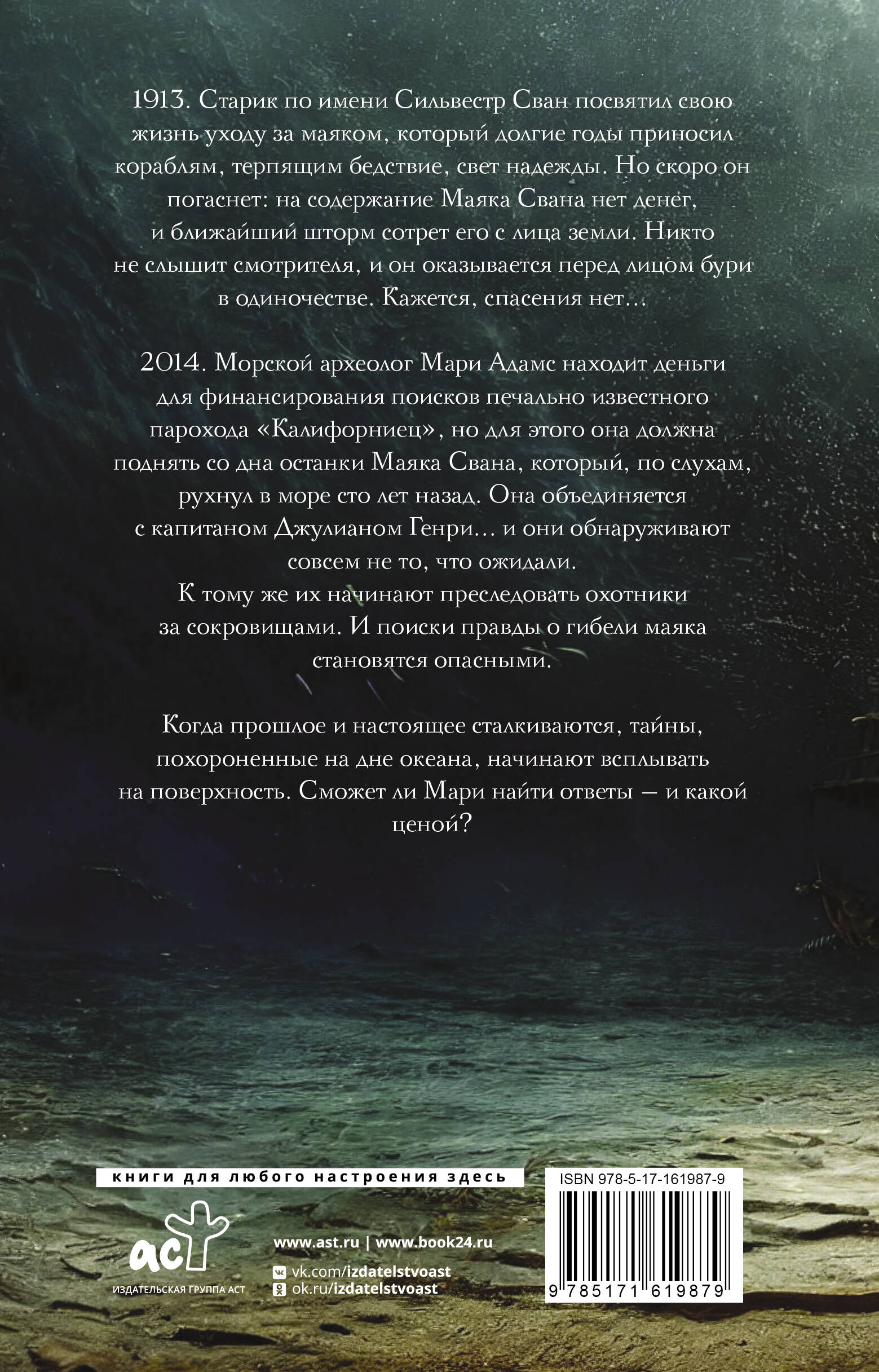 1913. Старик по имени Сильвестр Сван посвятил свою жизнь уходу за маяком, который долгие годы приносил кораблям, терпящим бедствие, свет надежды. Но скоро он погаснет: на содержание Маяка Свана нет денег, и ближайший шторм сотрет его с лица земли. Никто не слышит смотрителя, и он оказывается перед лицом бури в одиночестве. Кажется, спасения нет... 2014. Морской археолог Мари Адамс находит деньги для финансирования поисков печально известного парохода "Калифорниец", но для этого она должна поднять со дна останки Маяка Свана, который, по слухам, рухнул в море сто лет назад. Она объединяется с капитаном Джулианом Генри... и они обнаруживают совсем не то, что ожидали. К тому же их начинают преследовать охотники за сокровищами. Поиски правды о гибели маяка становятся опасными. Когда прошлое и настоящее сталкиваются, тайны, похороненные на дне океана, начинают всплывать на поверхность. Сможет ли Мари найти ответы - и какой ценой?| Издательство | Издательство "АСТ" |