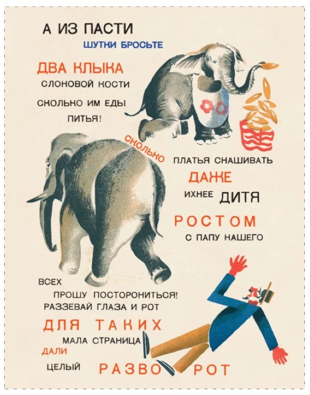 Существует множество книг для детей про зоопарки и зверинцы. Поэма Владимира Маяковского могла бы стать одной из них - первые строфы поэт записал на страницах путеводителя по нью-йоркскому зоопарку во время своего пребывания в Америке. Но «крупнейший поэт революции» не стал описывать животных в клетках. Если внимательно вчитаться в строчки и всмотреться в рисунки, нетрудно увидеть - звери специально помещены поэтом не в неволю, но в книгу, на белых просторных листах которой они разгуливают вполне свободно. Именно поэтому слова «страница», «разворот» неоднократно появляются в поэме; по той же причине художник Кирилл Зданевич рисует на обложке книгу, а не ворота зоосада. Первая строка стихотворения, приглашающая «открыть страницу-дверь», на самом деле является не просто красивой метафорой, но указывает на истинный смысл этой книжки, сконструированной по принципу литературного сафари - к свободным зверям можно подойти как угодно близко.