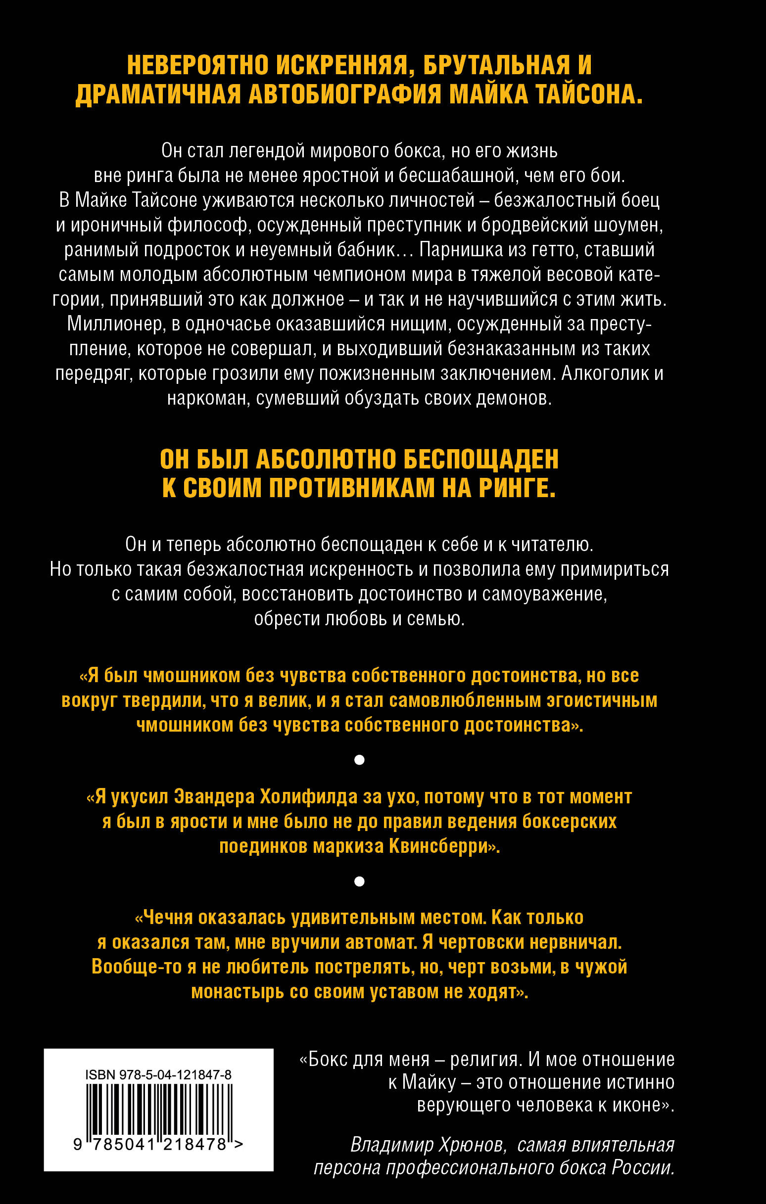 МИРОВОЙ БЕСТСЕЛЛЕР! Невероятно искренняя, брутальная и драматичная автобиография Майка Тайсона. Он стал легендой мирового бокса, но его жизнь вне ринга была не менее яростной и бесшабашной, чем его бои. В Майке Тайсоне уживаются несколько личностей - безжалостный боец и ироничный философ, осужденный преступник и бродвейский шоумен, ранимый подросток и неуемный бабник… Парнишка из гетто, ставший самым молодым абсолютным чемпионом мира в тяжелой весовой категории, принявший это как должное - и так и не научившийся с этим жить. Миллионер, в одночасье оказавшийся нищим, осужденный за преступление, которое не совершал, и выходивший безнаказанным из таких передряг, которые грозили ему пожизненным заключением. Алкоголик и наркоман, сумевший обуздать своих демонов. Он был абсолютно беспощаден к своим противникам на ринге. Он и теперь абсолютно беспощаден к себе и к читателю. Но только такая безжалостная искренность и позволила ему примириться с самим собой, восстановить достоинство и самоуважение, обрести любовь и семью. -------------------------------------------------- «Некоторые части "Беспощадной истины" похожи на сцены из фильмов Тарантино, происходящие в реальной жизни. Другие - словно экскурсия по самым разным мирам: от бруклинских трущоб до светской жизни Лас-Вегаса и тюремной изоляции... На каждой странице звучит неповторимый голос Майка Тайсона: не только причудливая смесь из уличной брани и лексикона программы реабилитации зависимых, но также и кинематографические описания боксерских боев, философские размышления, едкий юмор и многочисленные литературные и исторические отсылки - Толстой, Ленин, Теннесси Уильямс… Подлинное усилие мятежной души - так рассказать о своем нелегком и причудливом пути длиною в жизнь». - Митико Какутани, The New York Times «Толстенная биография, которая, возможно, станет самой откровенной книгой в своем жанре. Захватывающая, грубая, местами даже непристойная - и в то же время очень смешная». - Associated Press| Издательство | ООО "Издательство "Эксмо" |