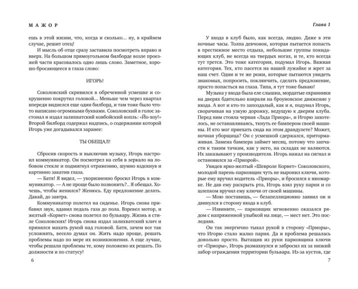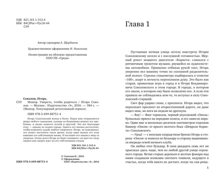 <table class="table table-bordered"><tbody><tr><td>Автор</td><td>Соколов Игорь</td></tr><tr><td>Издательство</td><td>Эксмо</td></tr><tr><td>Серия</td><td>Мажор. Популярный детективный сериал</td></tr><tr><td>Год</td><td>2017</td></tr><tr><td>ISBN</td><td>978-5-699-88751-4</td></tr><tr><td>Кол-во томов</td><td>1</td></tr><tr><td>Обложка</td><td>твердый переплет</td></tr><tr><td>Кол-во страниц</td><td>384</td></tr></tbody></table>| Автор/составитель | Соколов Игорь |