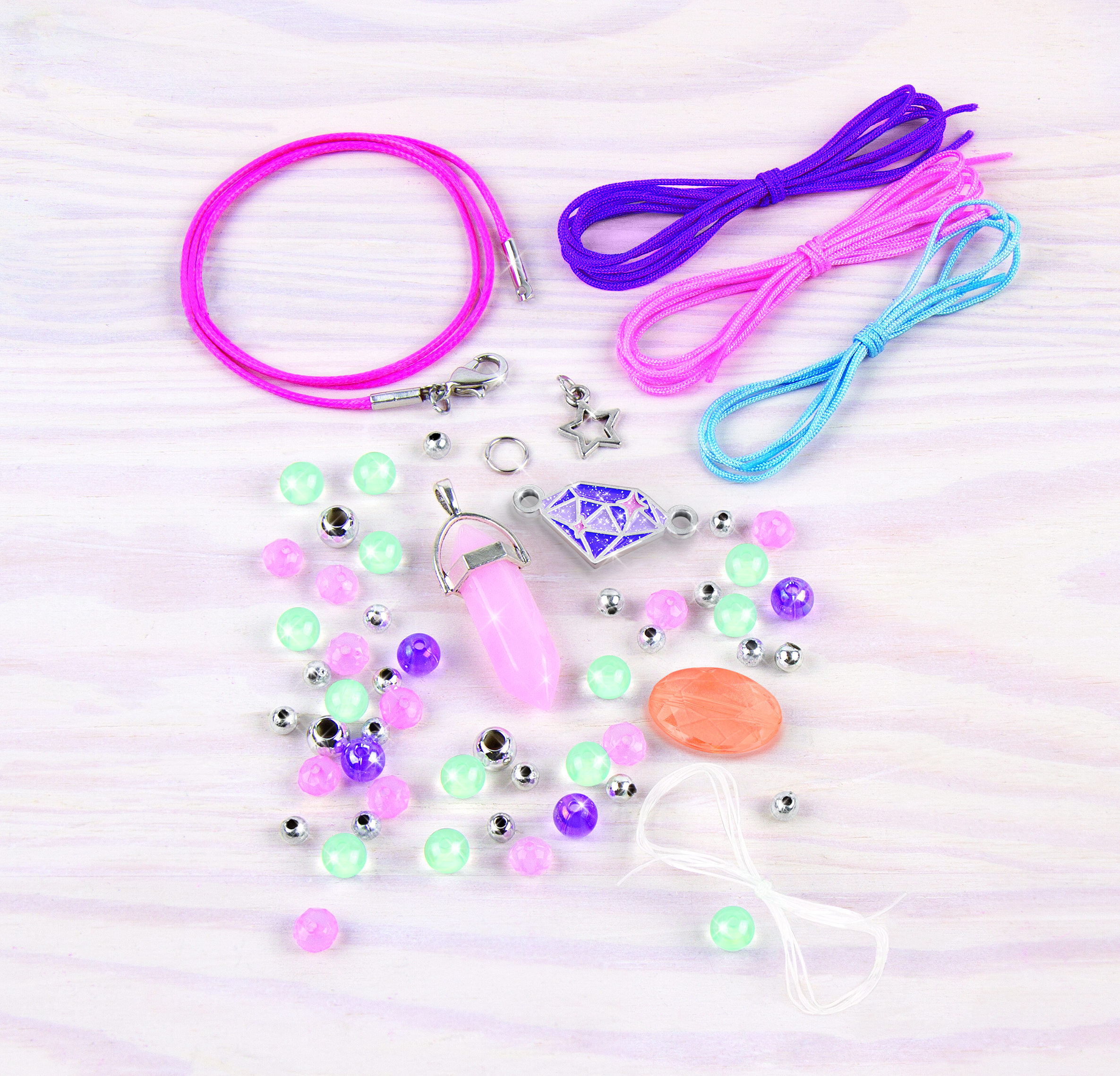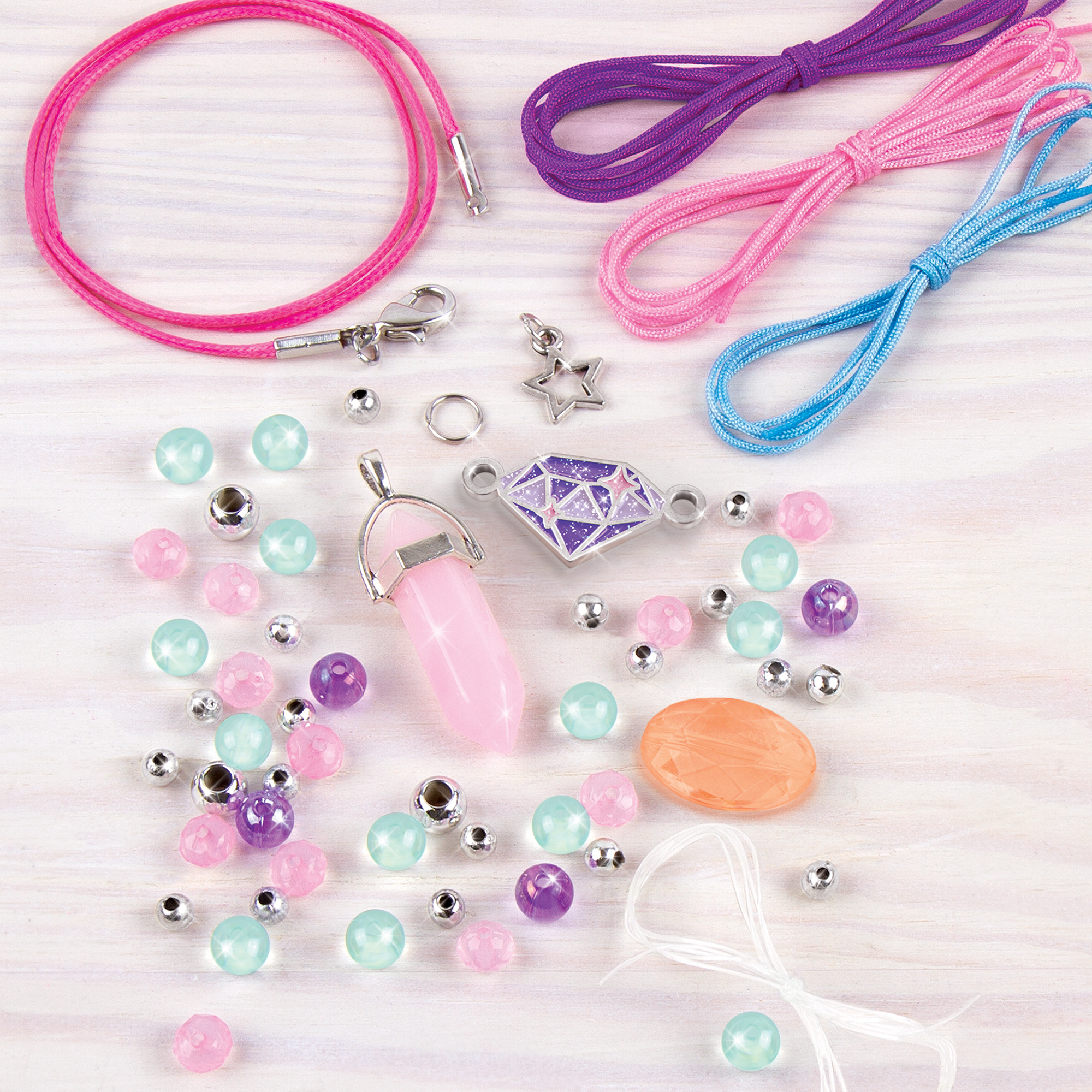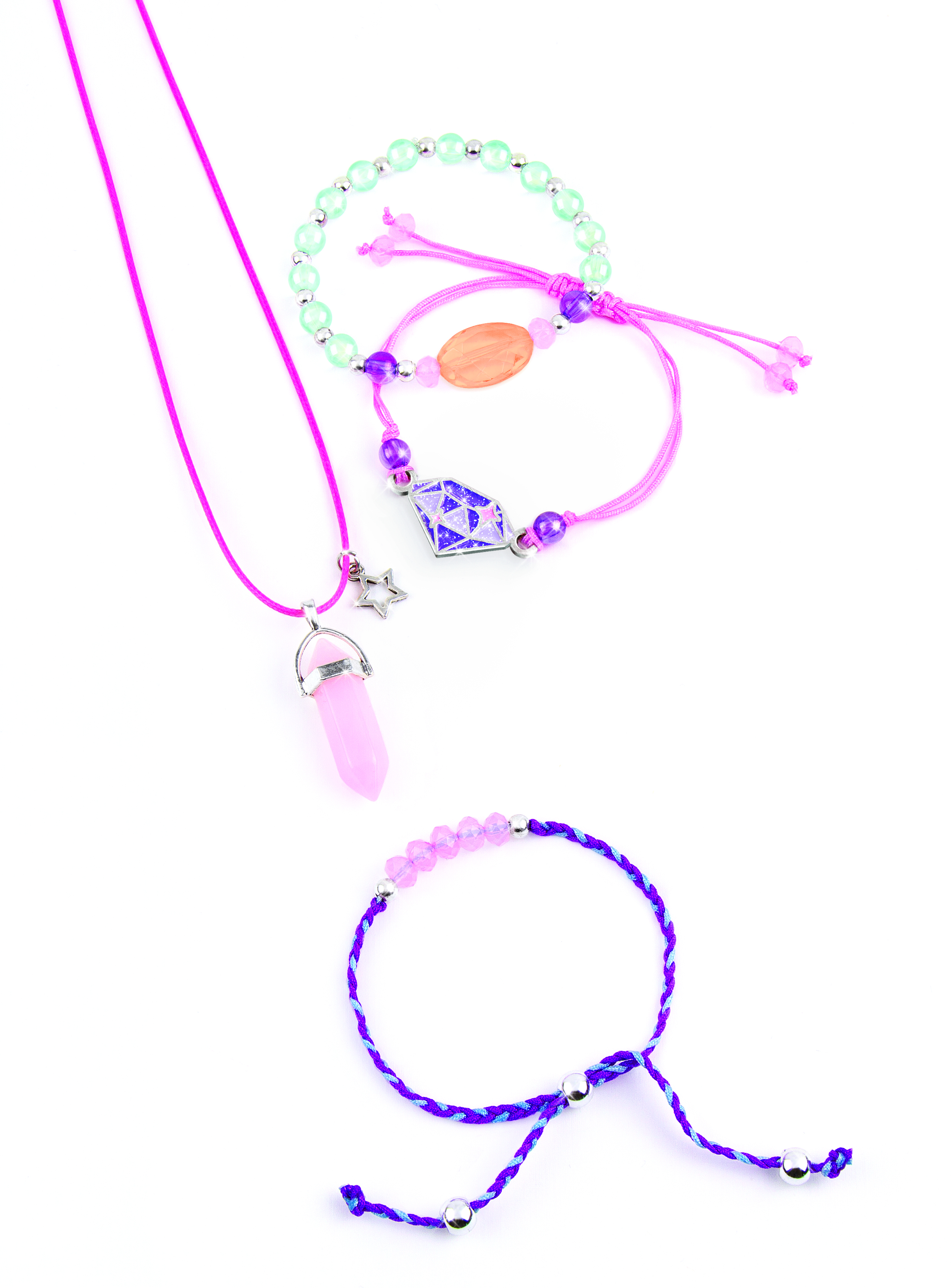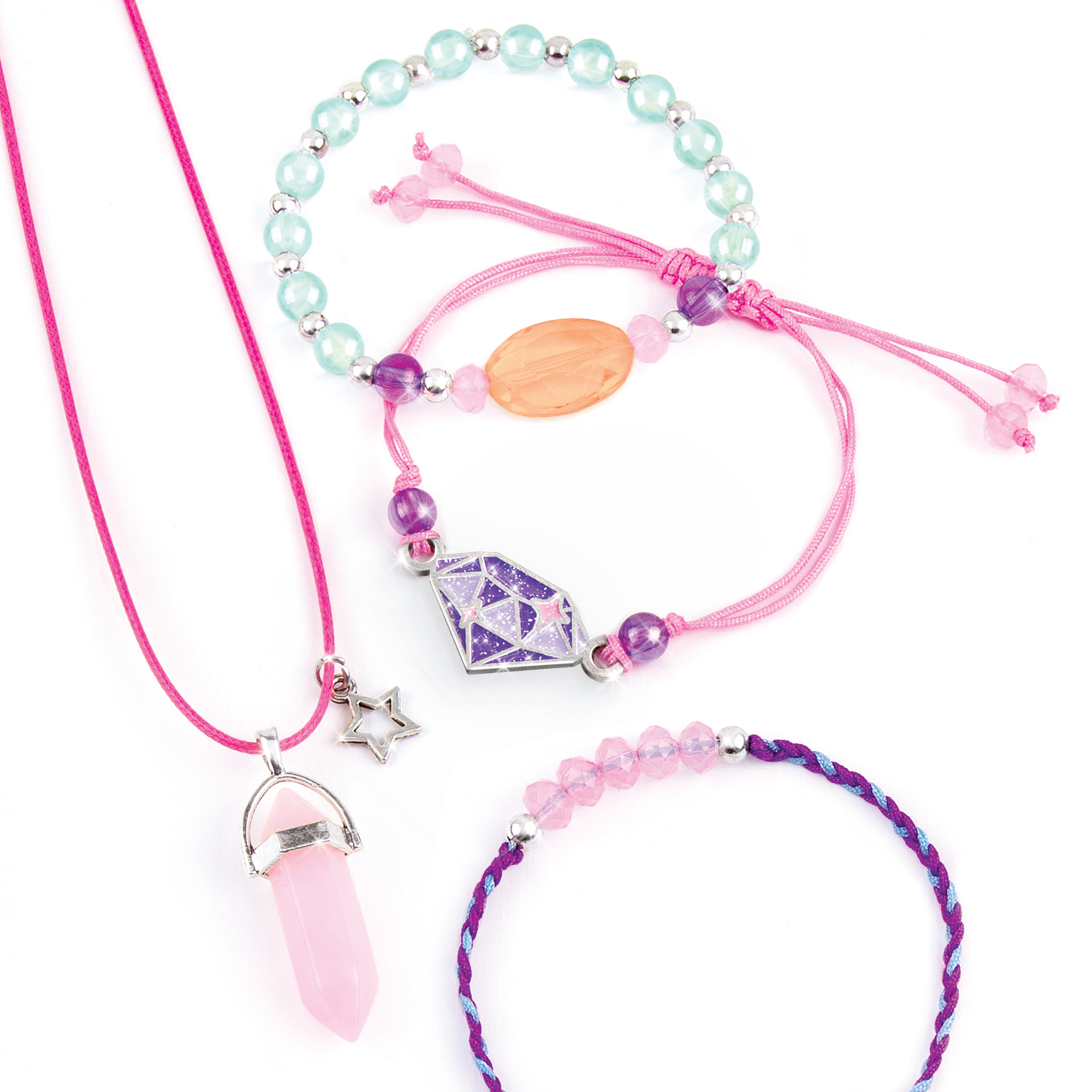 Хорошие настроения повсюду! Бусины в форме кристаллов создают ощущение покоя. Этот набор содержит компоненты для изготовления ожерелья и 3 браслетов.