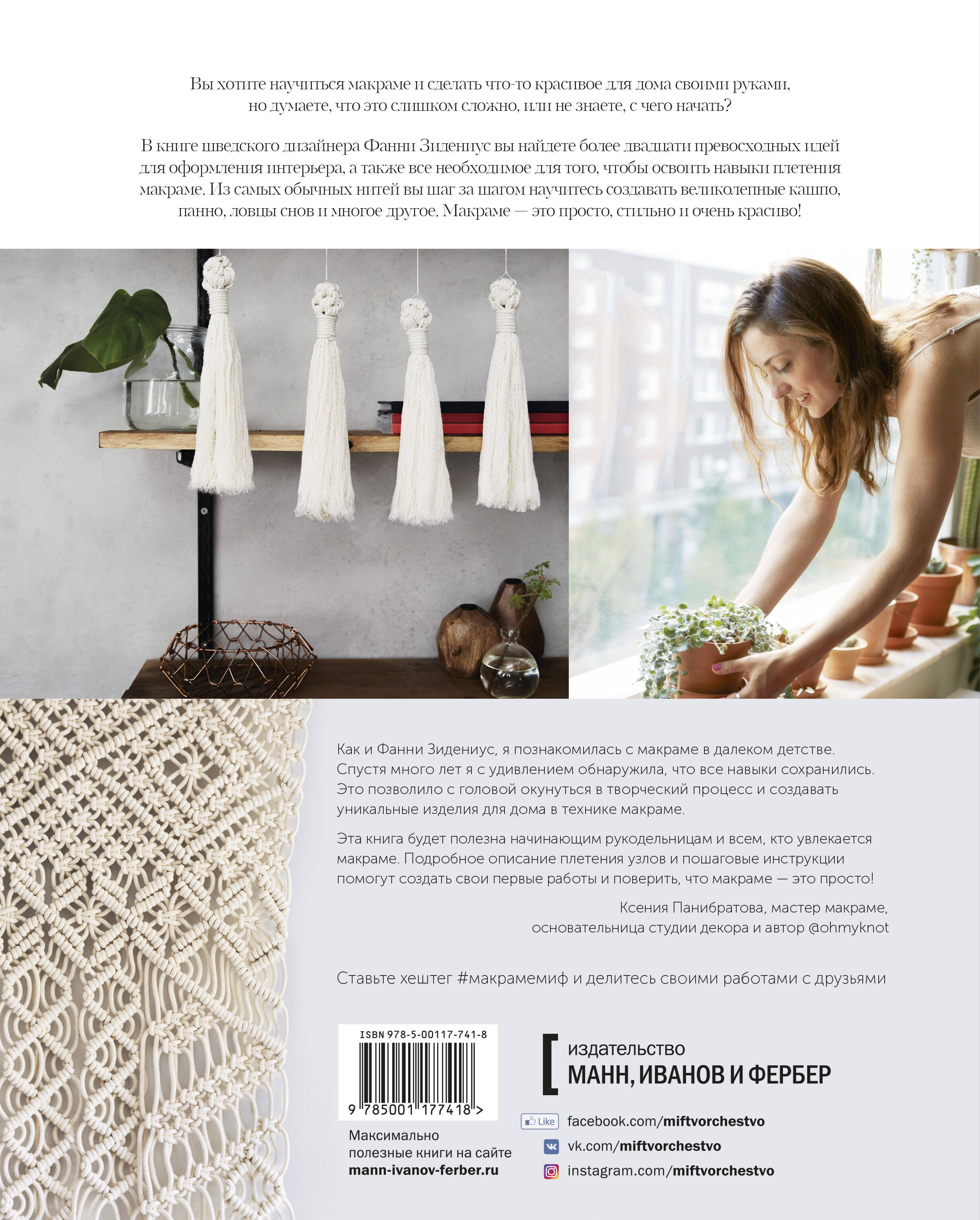 Фанни Зидениус познакомит вас с основными материалами, базовыми узлами и узорами в технике макраме. В этой книге вы найдете более двадцати превосходных идей для оформления интерьера и иллюстрированные пошаговые инструкции по их выполнению.| Издательство | МАНН, ИВАНОВ И ФЕРБЕР ООО |