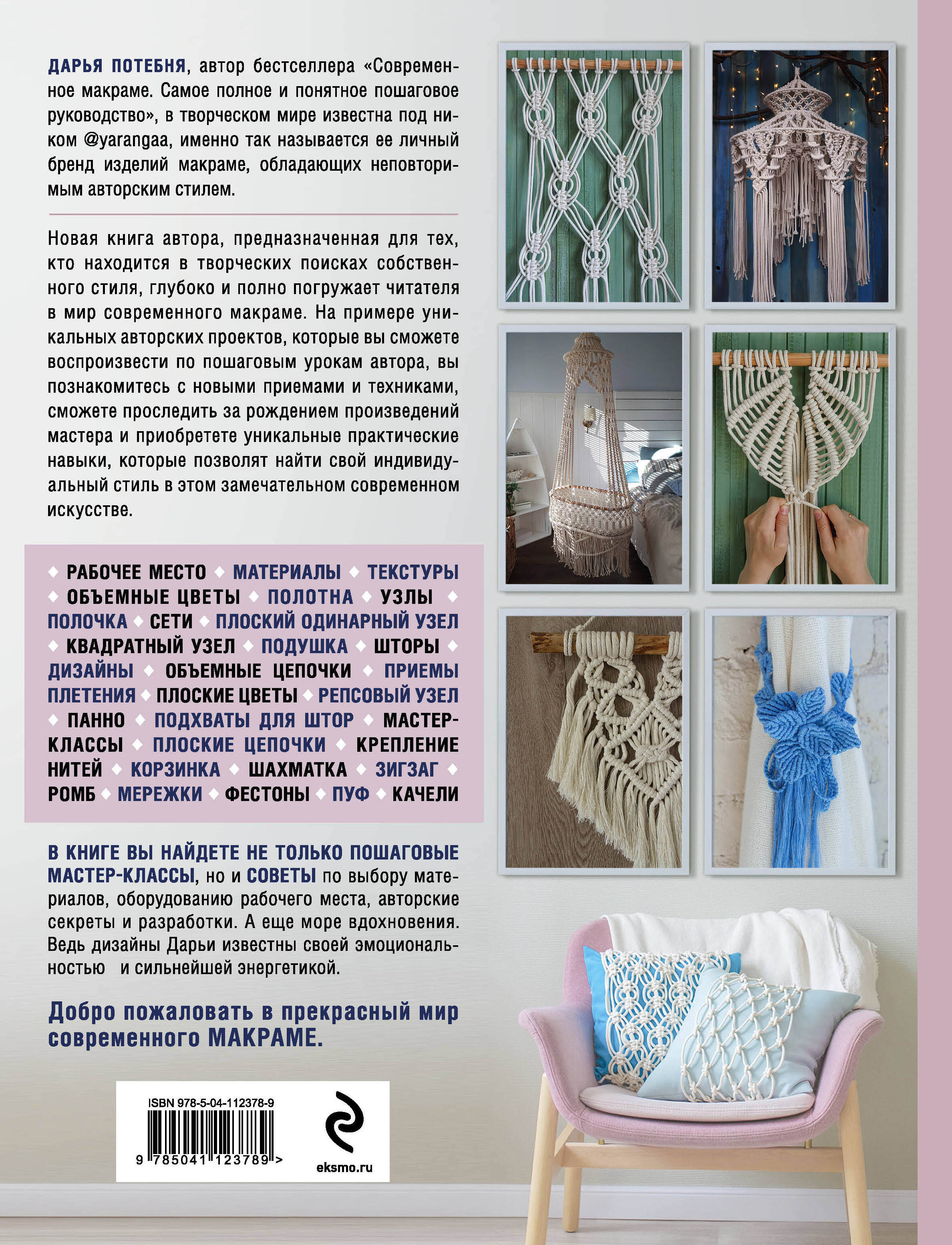 Новая книга от автора бестселлера «Современное макраме» Дарьи Потебня (@yarangaa)! Предназначенная для всех, кто уже знаком с основами макраме, она еще глубже погружает читателя в мир этого удивительного искусства, раскрывает перед ним новые узлы и техники, делится секретами работы со шнуром и и тонкостями технологии создания красивых, стильных, современных и эффектных изделий для интерьера. Вы не только влюбитесь в искусство макраме на всю жизнь, но и станете настоящим мастером плетения и научитесь создавать собственные проекты и дизайны.| Издательство | ООО "Издательство "Эксмо" |