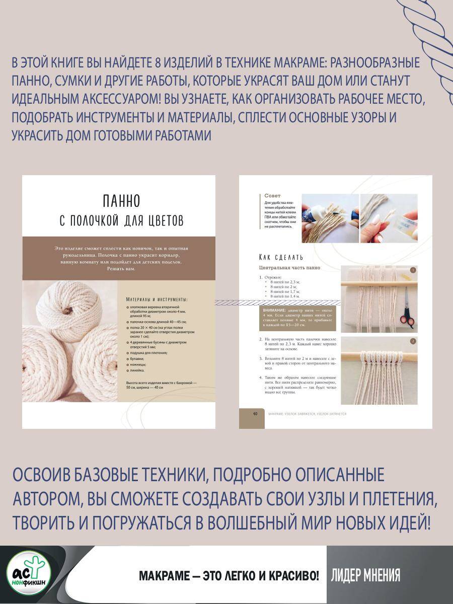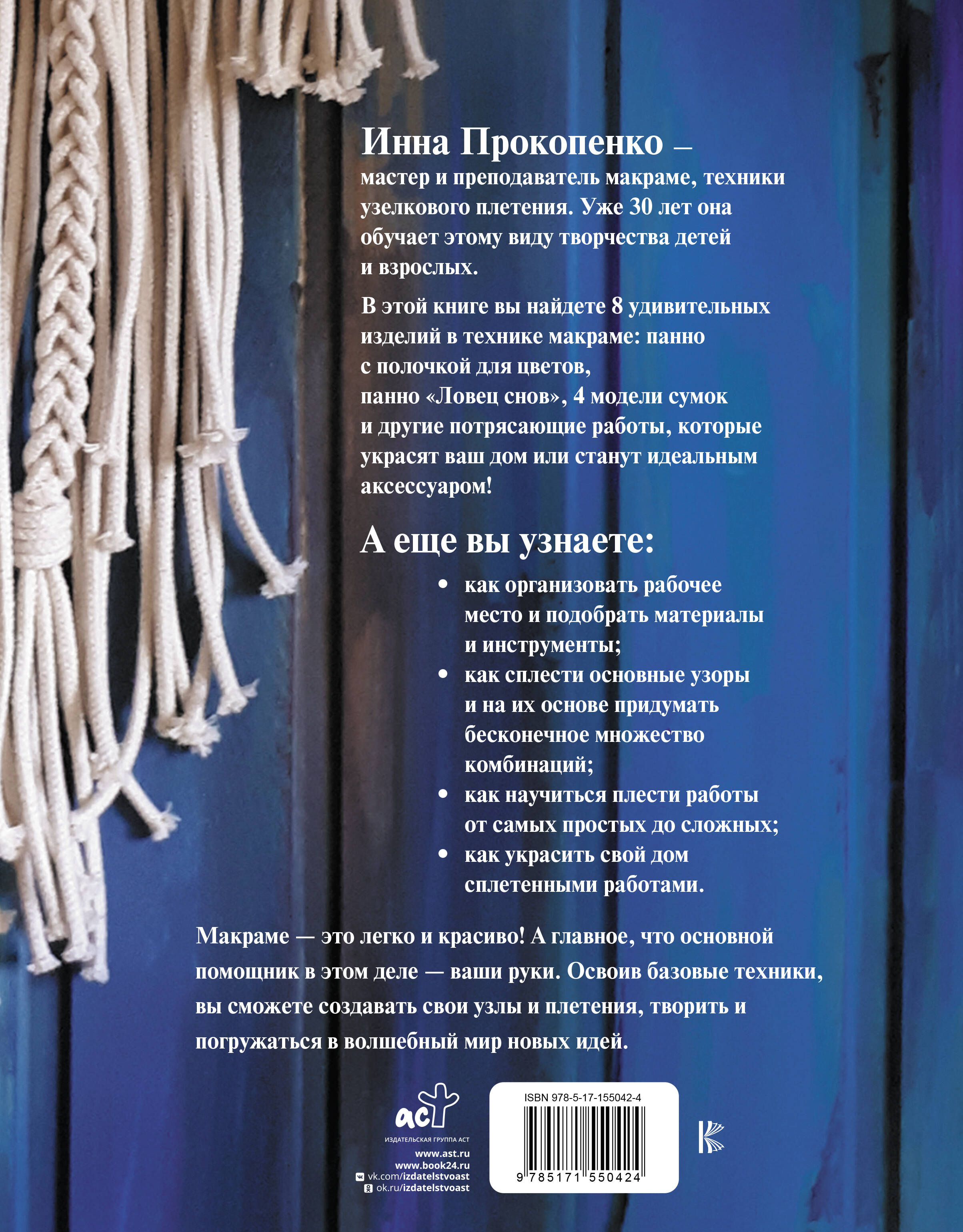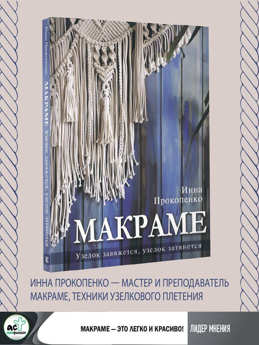 Инна Прокопенко - мастер и преподаватель макраме, техники узелкового плетения. В этой книге вы найдете 8 изделий в технике макраме: разнообразные панно, сумки и другие работы, которые украсят ваш дом или станут идеальным аксессуаром! Вы узнаете, как организовать рабочее место, подобрать инструменты и материалы, сплести основные узоры и украсить дом готовыми работами. Освоив базовые техники, подробно описанные автором, вы сможете создавать свои узлы и плетения, творить и погружаться в волшебный мир новых идей. Цветная книга большого формата станет отличным подарком для всех любителей рукоделия.| Издательство | ИЗДАТЕЛЬСТВО "АСТ" |