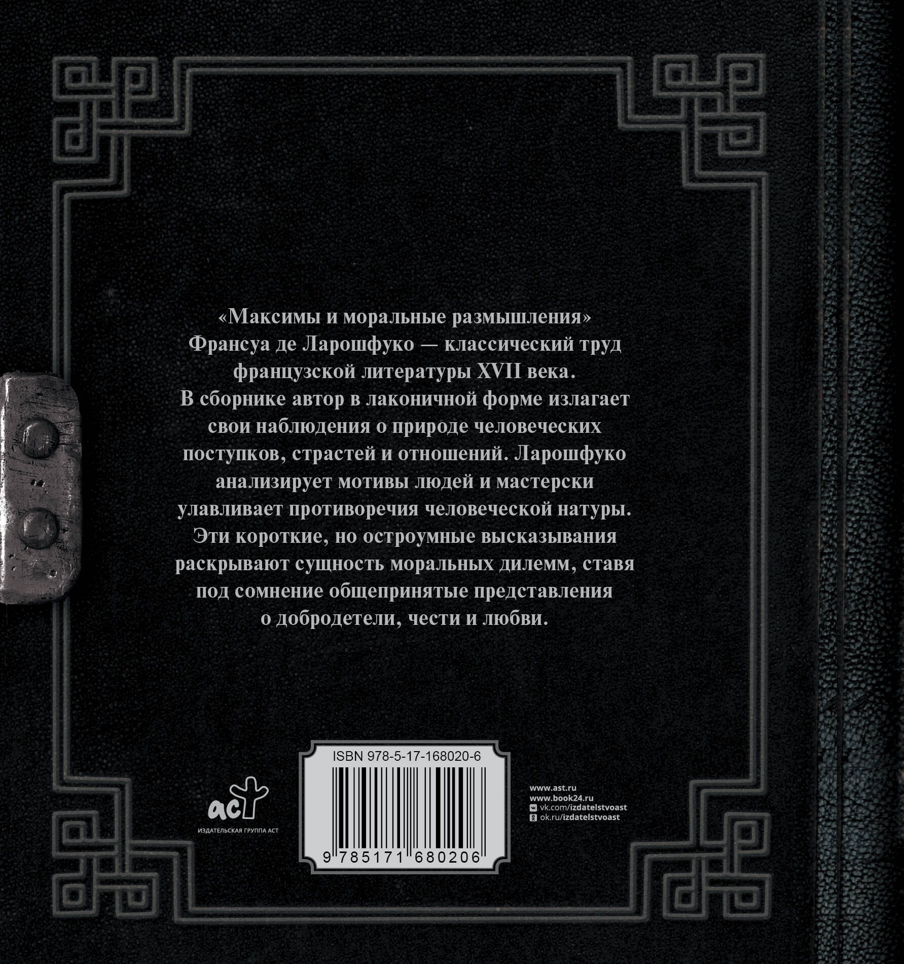 "Максимы и моральные размышления" Франсуа де Ларошфуко - классический труд французской литературы XVII века. В сборнике автор в лаконичной форме выражает свои наблюдения о природе человеческих поступков, страстей и отношений. Ларошфуко анализирует мотивы людей и мастерски улавливает противоречия человеческой натуры. Эти короткие, но остроумные высказывания раскрывают сущность моральных дилемм, ставя под сомнение общепринятые представления о добродетели, чести и любви.| Издательство | Издательство "АСТ" |