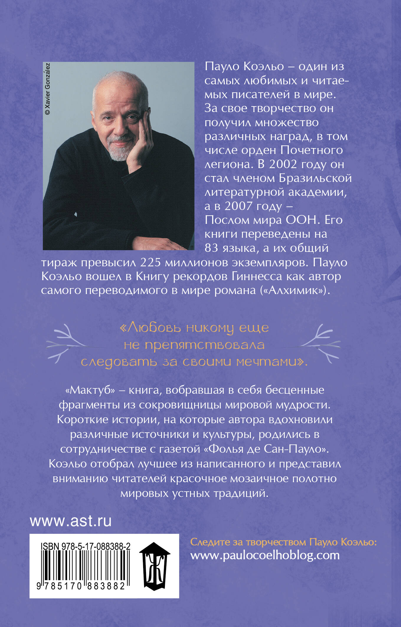 "Мактуб" - книга, вобравшая в себя бесценные фрагменты из сокровищницы мировой мудрости. Короткие истории, на которые автора вдохновили различные источники и культуры, родились в сотрудничестве с газетой "Фолья де Сан-Пауло". Коэльо отобрал лучшее из написанного и представил вниманию читателей красочное мозаичное полотно мировых устных традиций.| Издательство | ИЗДАТЕЛЬСТВО "АСТ" |