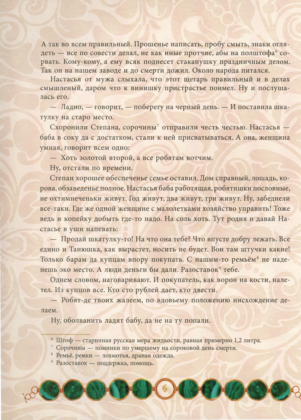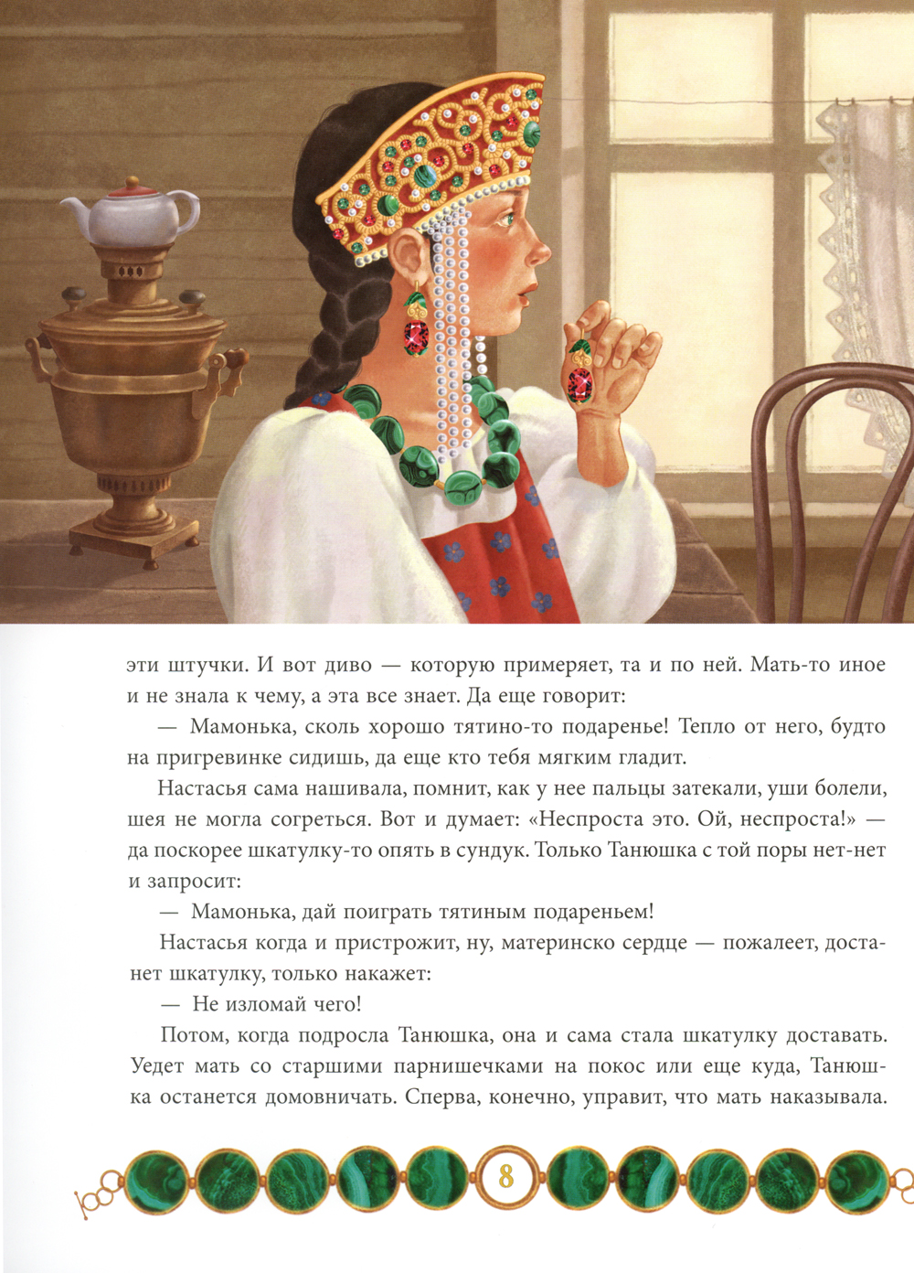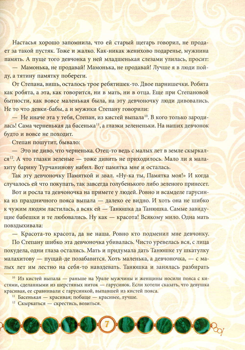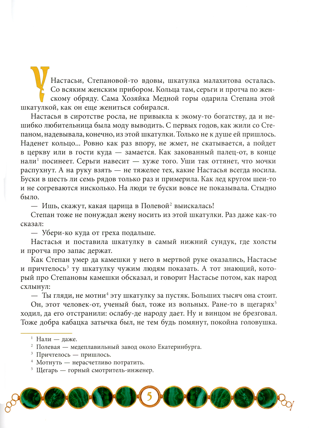 Павел Петрович Бажов (1879-1950) родился на Урале в заводском поселке Сысерть, в семье горного мастера. Детство провел среди старателей и мастеров, добывающих и обрабатывающих малахит и слюду. После окончания духовной семинарии преподавал русский язык в Екатеринбурге, много путешествовал по Уралу, собирал народные былички, легенды и сказки. На этом материале и были созданы знаменитые Бажовские сказы, произведения, в которых неразрывно переплетены правда и вымысел. «Малахитовая шкатулка» - один из самых известных сказов П. Бажова. Это история взросления маленькой девочки, дочери известного старателя и мастера, и превращения ее в гордую и независимую красавицу, которой покровительствует сама Хозяйка Медной горы.| Издательство | Акварель |