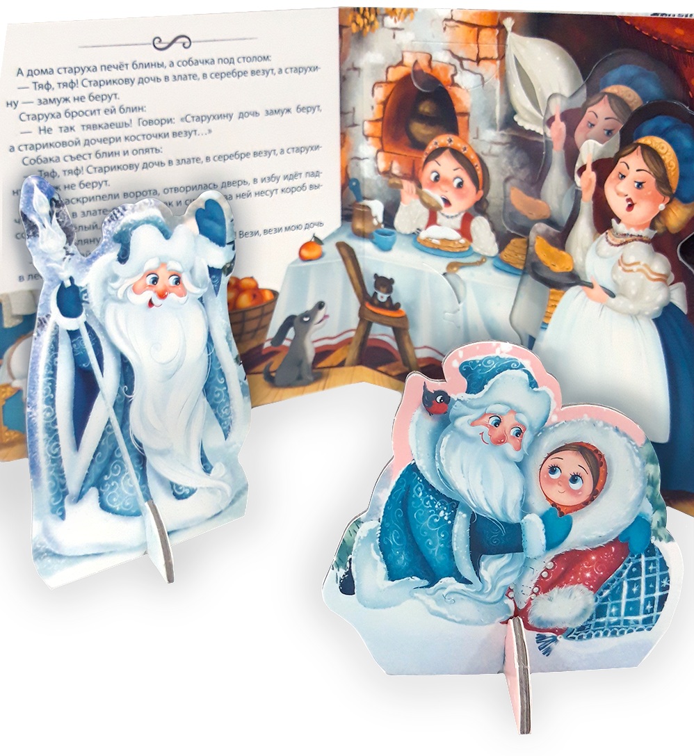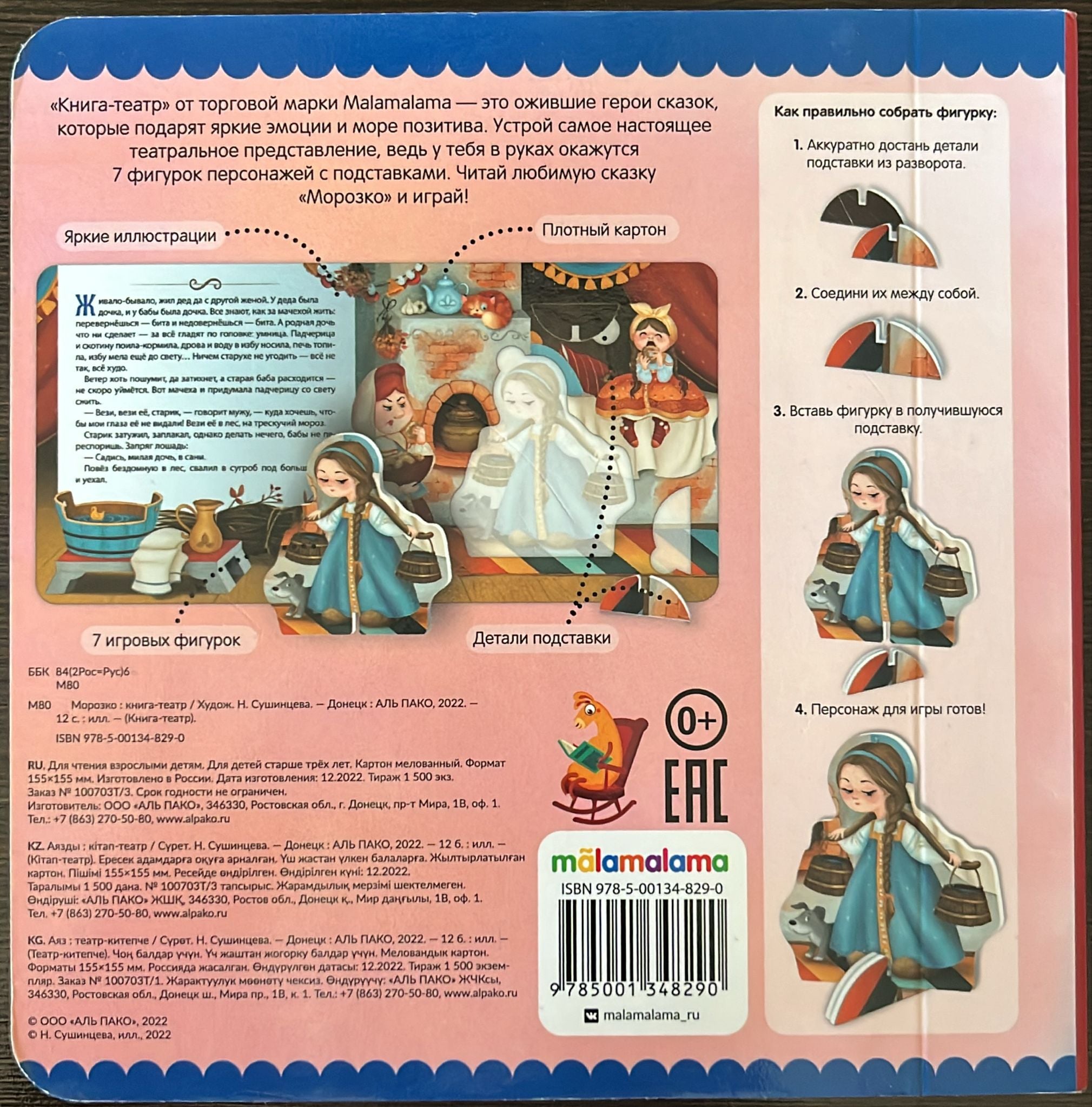 Книга-театр «Морозко» от торговой марки Malamalama - это маленький театр прямо на вашем столе! История о двух девушках - доброй и злой, о жадной старухе, бедном старике и справедливом зимнем волшебнике, оживёт перед вами для увлекательной игры. Нужно только поставить фигурки в специальные подставки, и герои для домашнего представления перед вами! Собирайте всю коллекцию серии «Книга-театр», разыгрывайте любимые сказки или придумывайте свои вместе с Malamalama!