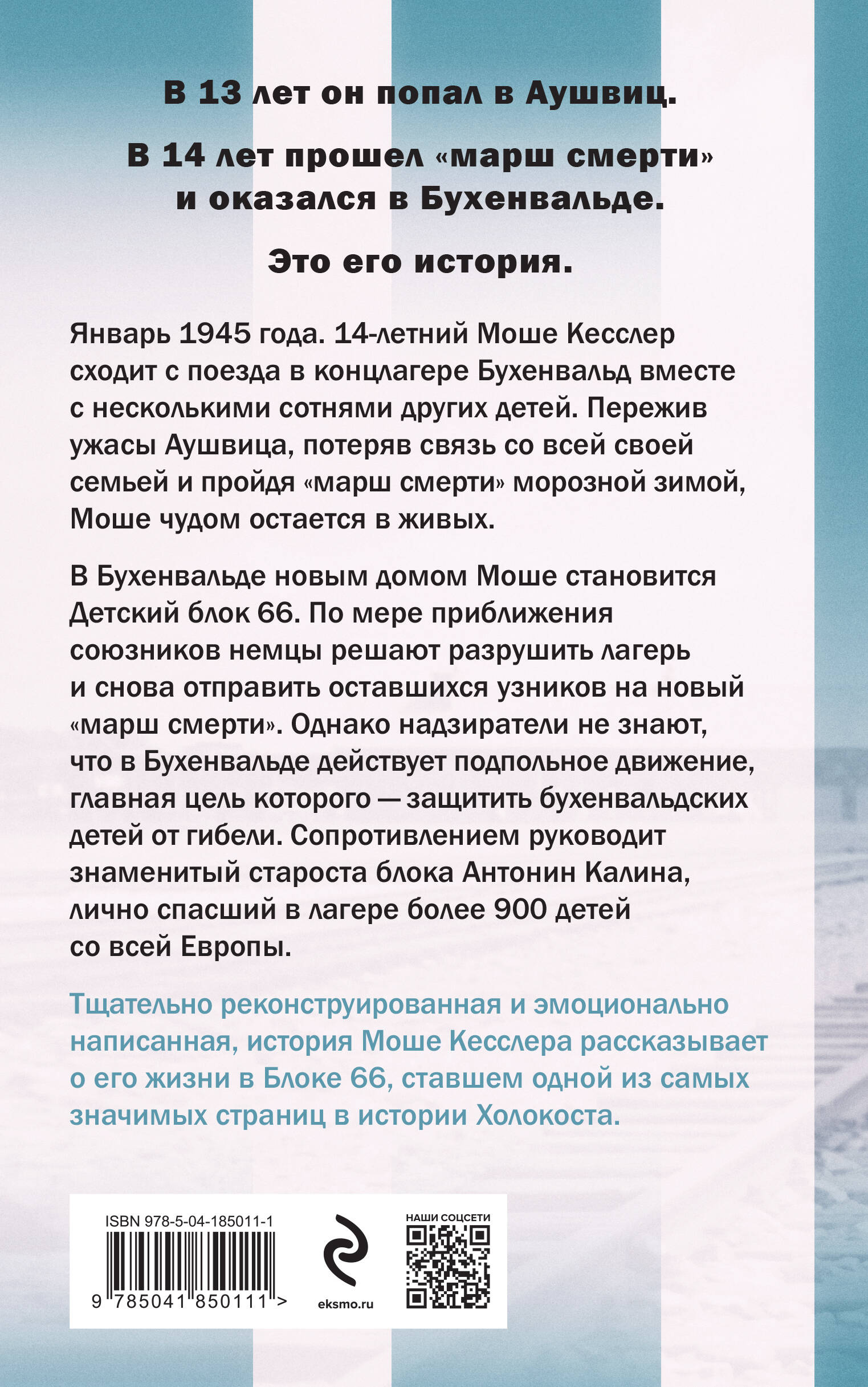 В 13 лет он попал в Аушвиц. В 14 лет - прошел «марш смерти» и оказался в Бухенвальде. Это его история. Январь 1945 года. Четырнадцатилетний Моше Кесслер сходит с поезда в концлагере Бухенвальд вместе с несколькими сотнями других детей. Пройдя сквозь ужасы Аушвица, потеряв связь со всей своей семьей и пережив «марш смерти» - двое суток пути на морозе в одной лишь тоненькой пижаме, - Моше чудом остался в живых. В Бухенвальде новым домом Моше становится Детский блок 66. По мере приближения союзников немцы решают разрушить лагерь и снова отправить оставшихся узников на новый «марш смерти». Однако надзиратели не знают, что в Бухенвальде действует подпольное движение, главная цель которого - защитить бухенвальдских детей от гибели. Сопротивлением руководит знаменитый староста блока Антонин Калина, лично спасший в лагере более 900 детей со всей Европы. Тщательно реконструированная и эмоционально написанная, история Моше Кесслера рассказывает о его жизни в Блоке 66, ставшем одной из самых значимых страниц в истории Холокоста. Книга содержит 24 страницы цветных иллюстраций.| Издательство | ООО "Издательство "Эксмо" |