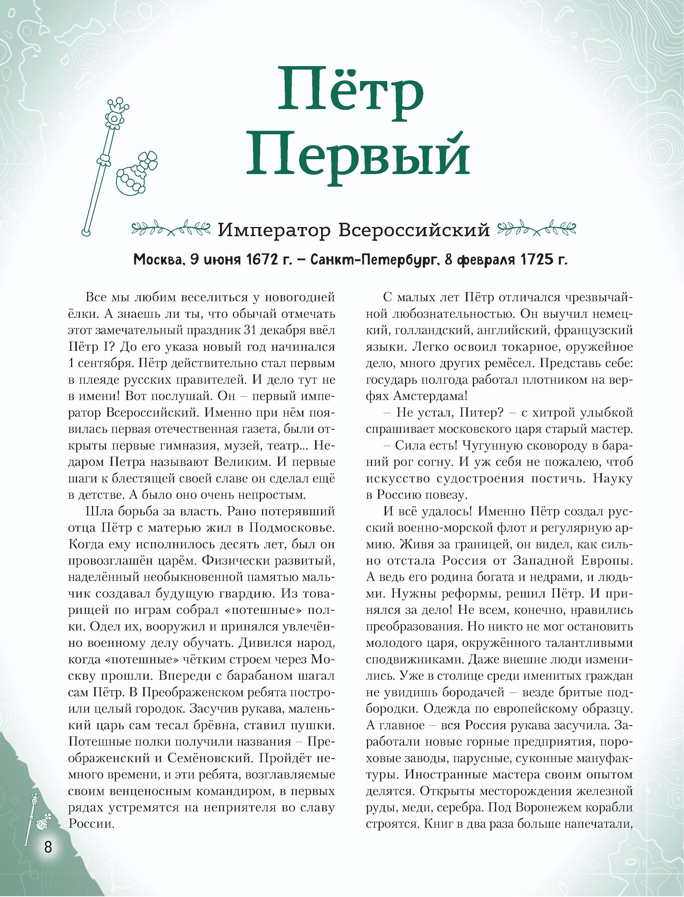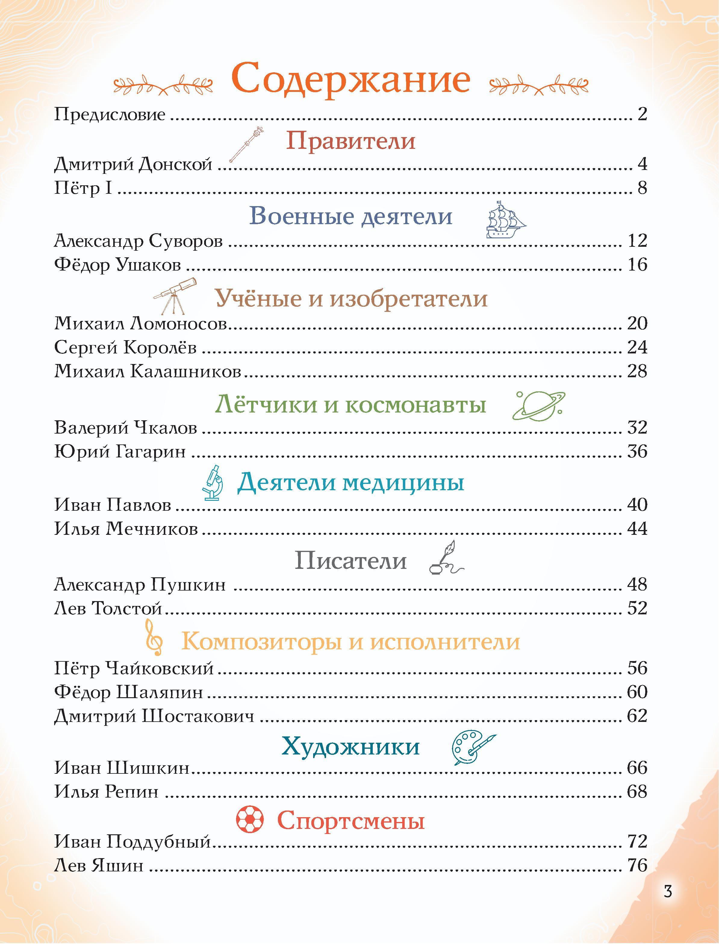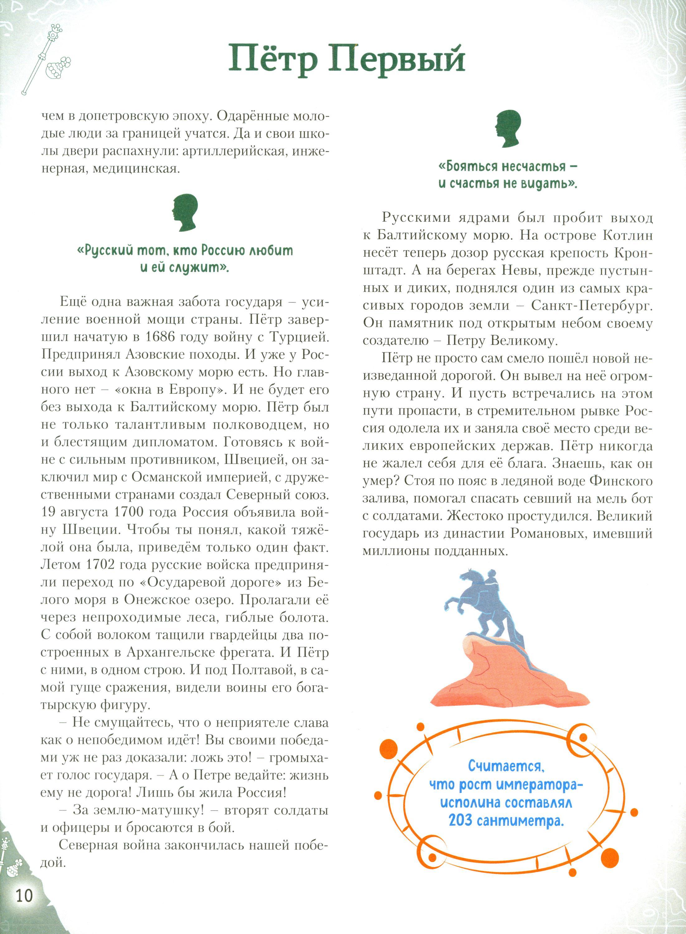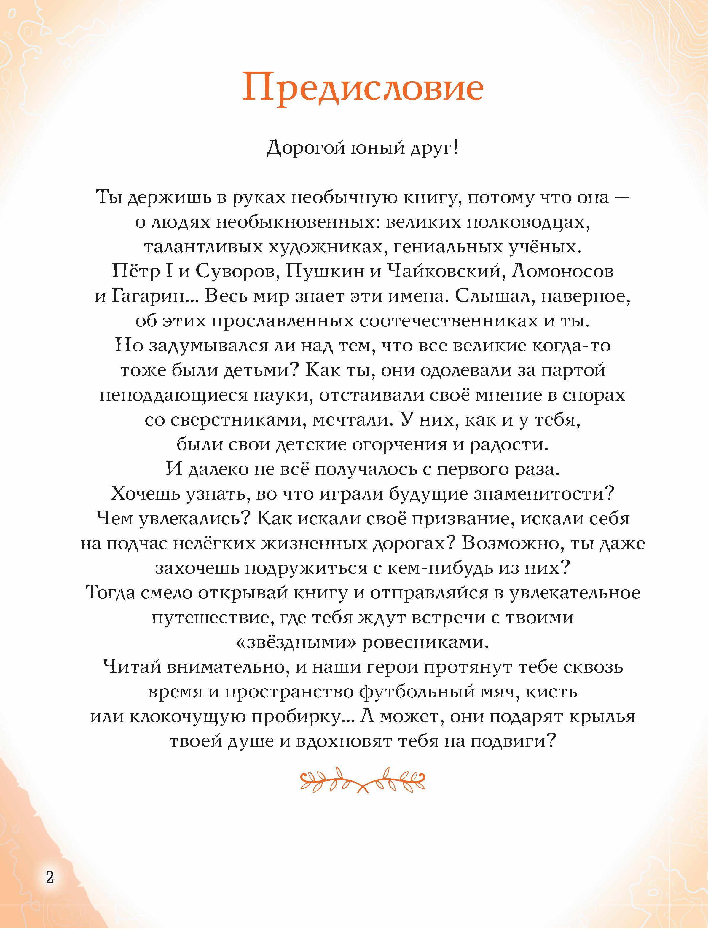 Отправляйтесь в захватывающее путешествие по разным эпохам нашей страны! Вы хотите познакомить вашего ребёнка с известными людьми России - Петром I и Суворовым, Пушкиным и Чайковским, Ломоносовым и Гагариным? Узнать, во что играли будущие исторические личности? Чем увлекались в детстве? Как искали свою судьбу, искали себя на нелёгких жизненных дорогах? Ведь они так же, как и все мы, одолевали за партой неподдающиеся науки, отстаивали собственное мнение в спорах; у них были свои детские огорчения и радости. И далеко не всё получалось с первого раза... Тогда открывайте эту книгу! В каждом из 20 биографических рассказов, адаптированных для детей 7-10 лет, - невероятный образец силы воли и стойкости характера, мотивирующий ребят на собственные свершения. Их сопровождают красочные полосные иллюстрации и занимательные факты, чтобы знакомиться с выдающимися соотечественниками было наглядно и увлекательно. А ещё это неповторимый подарок для всех, кто гордится историей и культурой своего Отечества!| Издательство | Эксмо |