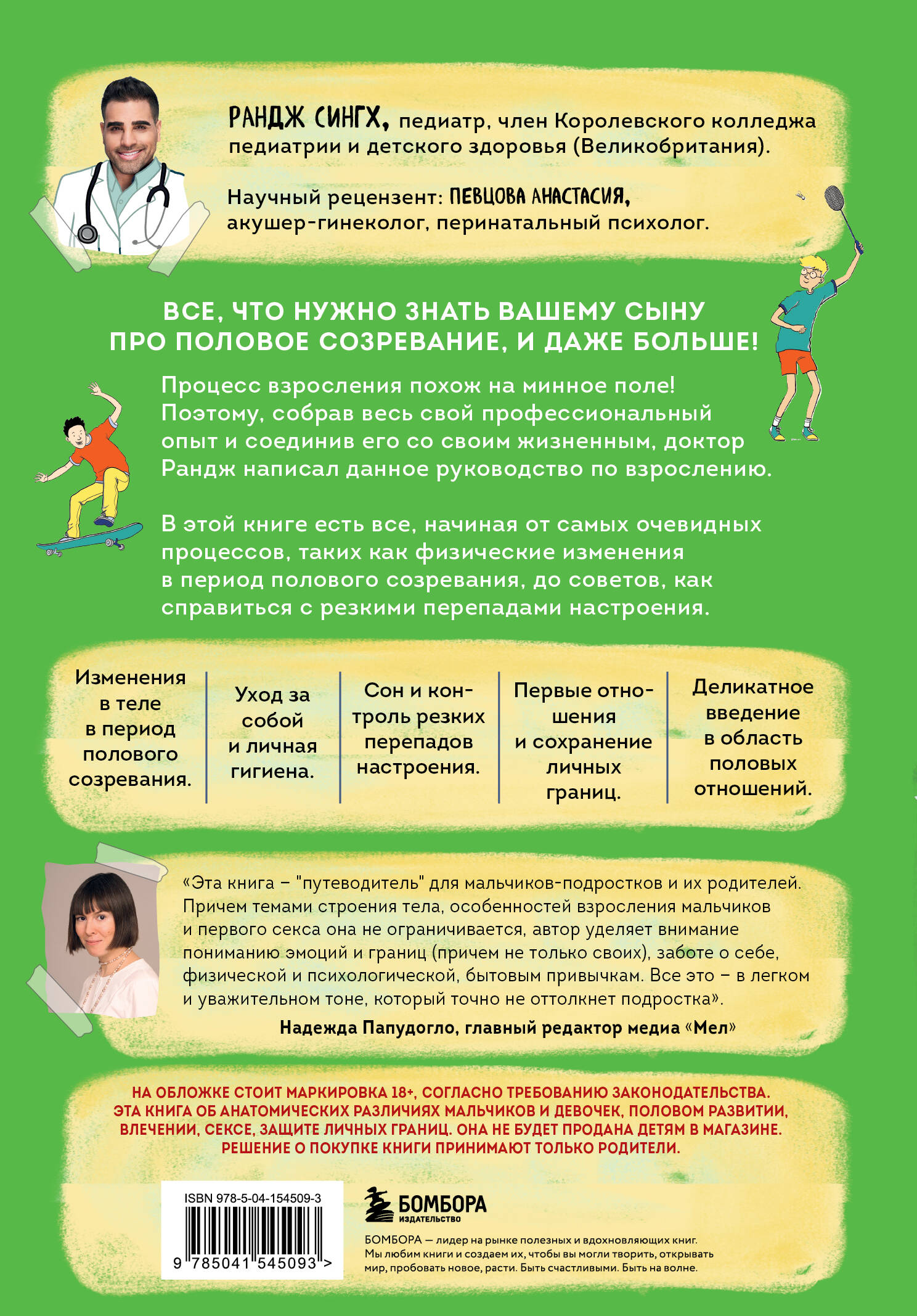 Изменения в теле в период полового созревания. Уход за собой и личная гигиена. Сон и контроль резких перепадов настроения. Первые отношения и сохранение личных границ. Деликатное введение в область половых отношений. «Эта книга - "путеводитель" для мальчиков-подростков и их родителей. Причем темами строения тела, особенностей взросления мальчиков и первого секса она не ограничивается, автор уделяет внимание пониманию эмоций и границ (причем не только своих), заботы о себе, физической и психологической, бытовым привычкам. Все это - в легком и уважительном тоне, который точно не оттолкнет подростка». - Надежда Папудогло, главный редактор медиа «Мел» «Эта книга просто, откровенно и деликатно говорит о вещах, которые волнуют каждого мальчика в период полового созревания. Например, чего следует ожидать в этот период? Как ухаживать за собой? Как бриться и как часто мыться? И что вообще со всем этим делать? Мой 8-летний сын уже задает много вопросов на данную тему. Знания - это сила. И с помощью этой книги его плавание по морю полового созревания пройдет без лишних переживаний и сюрпризов». - Руслан Меллин, главный челюстно-лицевой хирург Республики Хакасия, автор блога ruslanmellin На обложке стоит маркировка 18+, согласно требованию законодательства. Эта книга об анатомических различиях мальчиков и девочек, половом развитии, влечении, сексе, защите личных границ. Она не будет продана детям в магазине. Решение о покупке книги принимают только родители.| Издательство | Эксмо |