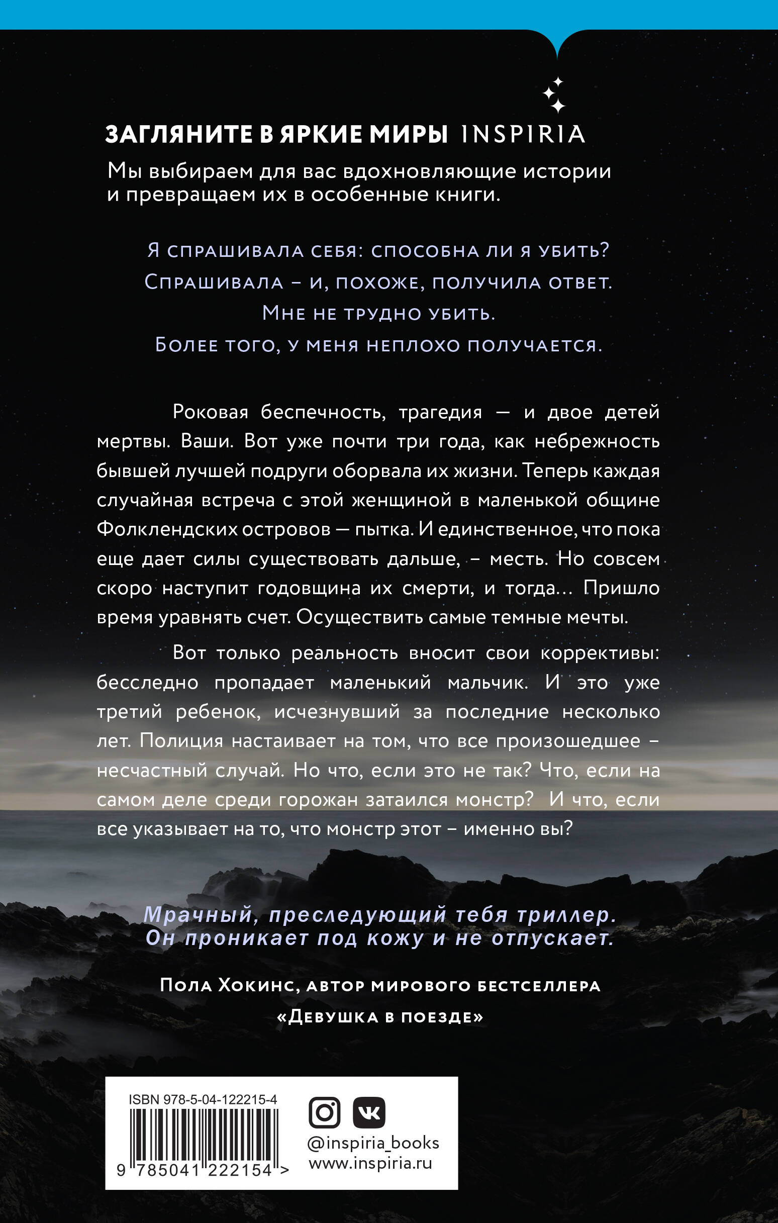 Автор - обладательница премий Мэри Хиггинс Кларк и CWA Dagger in the Library Я спрашивала себя: способна ли я убить? Спрашивала - и, похоже, получила ответ. Мне не трудно убить. Более того, у меня неплохо получается. Роковая беспечность, трагедия - и двое детей мертвы. Ваши. Вот уже почти три года как небрежность бывшей лучшей подруги оборвала их жизни. Теперь каждая случайная встреча с этой женщиной в маленькой общине Фолклендских островов - пытка. И единственное, что пока еще дает силы существовать дальше - месть. Но совсем скоро наступит годовщина их смерти, и тогда… Пришло время уравнять счет. Осуществить самые темные мечты. Вот только реальность вносит свои коррективы: бесследно пропадает маленький мальчик. И это уже третий ребенок, исчезнувший за последние несколько лет. Полиция настаивает на том, что все произошедшее - несчастный случай. Но что, если это не так? Что, если на самом деле среди горожан затаился монстр? И что, если всё указывает на то, что монстр этот - именно вы? «Мрачный, преследующий тебя триллер. Он проникает под кожу и не отпускает». - Пола Хокинс, автор мирового бестселлера «Девушка в поезде» «Я в восторге! Я не ложилась спать и полностью игнорировала свою семью. Это идеальный триллер. Захватывающая картина, полная секретов и предательств. Друзья, любовники, соседи - каждому есть что скрывать...» - Лиза Гарднер «Хорошо продуманная колыбель лжи и предательства. Но что делает эту книгу особенной, так это яркое изображение самих Фолклендских островов, будь то дикая природа или клаустрофобная природа человеческого существования на маленьком острове». - The Guardian «Максимально мрачная и эмоциональная история, способная выбить почву из-под ваших ног. Напряжение будет нарастать с каждой главой, а финал сумеет несколько раз вас удивить и в итоге шокировать. Автору удалось мастерски раскрыть характеры всех персонажей и обнажить их самые темные стороны. Блестящий психологический триллер». - Книжный блогер Гарри @ultraviolence_g| Издательство | ООО "Издательство "Эксмо" |