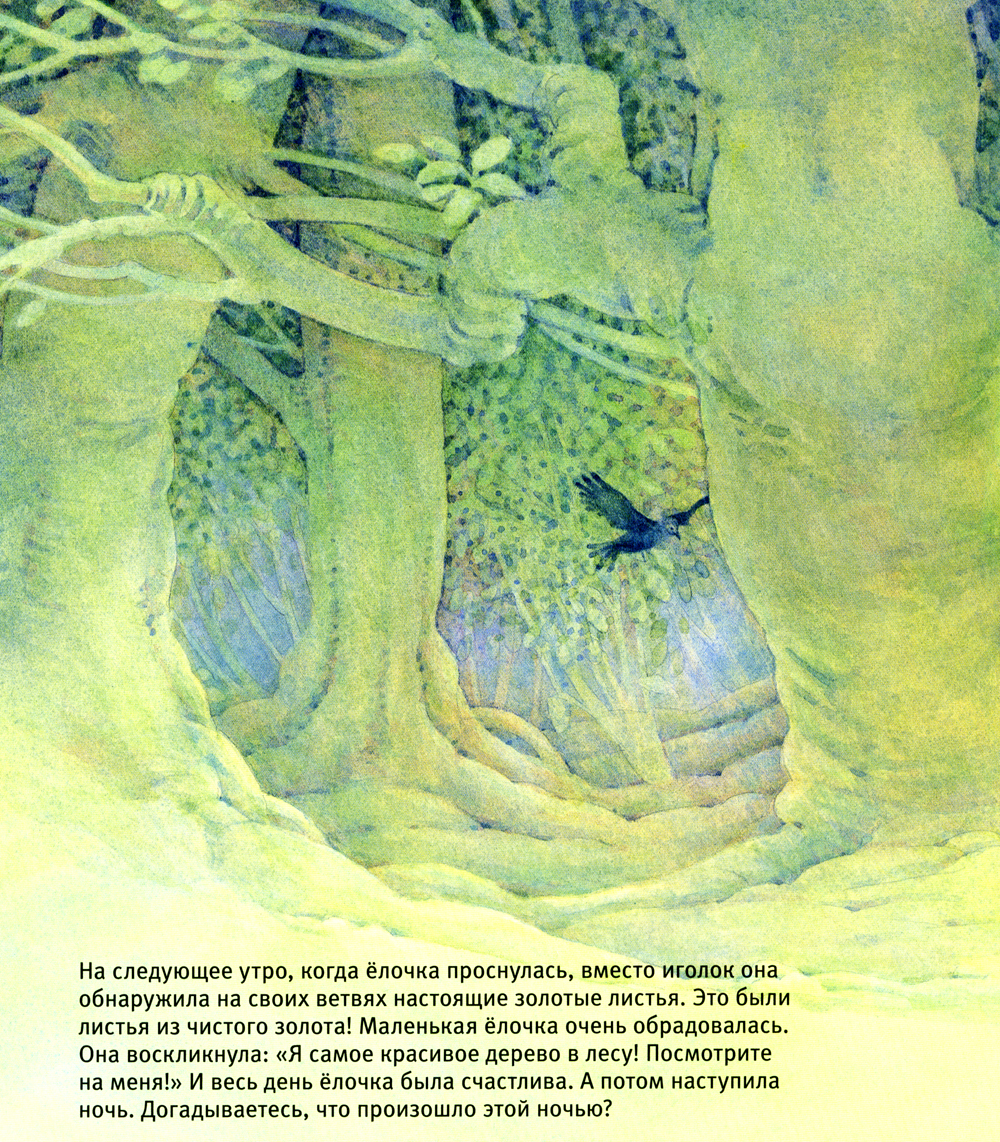 Маленькая елочка очень хотела стать самым красивым деревом в лесу и ради этого поменяла свои колючие иголки на листья. Но даже золотые и хрустальные листья не сделали елочку счастливой; потеряв их, она поняла, что только став самим собой, можно обрести подлинную красоту, которую обязательно оценят окружающие.