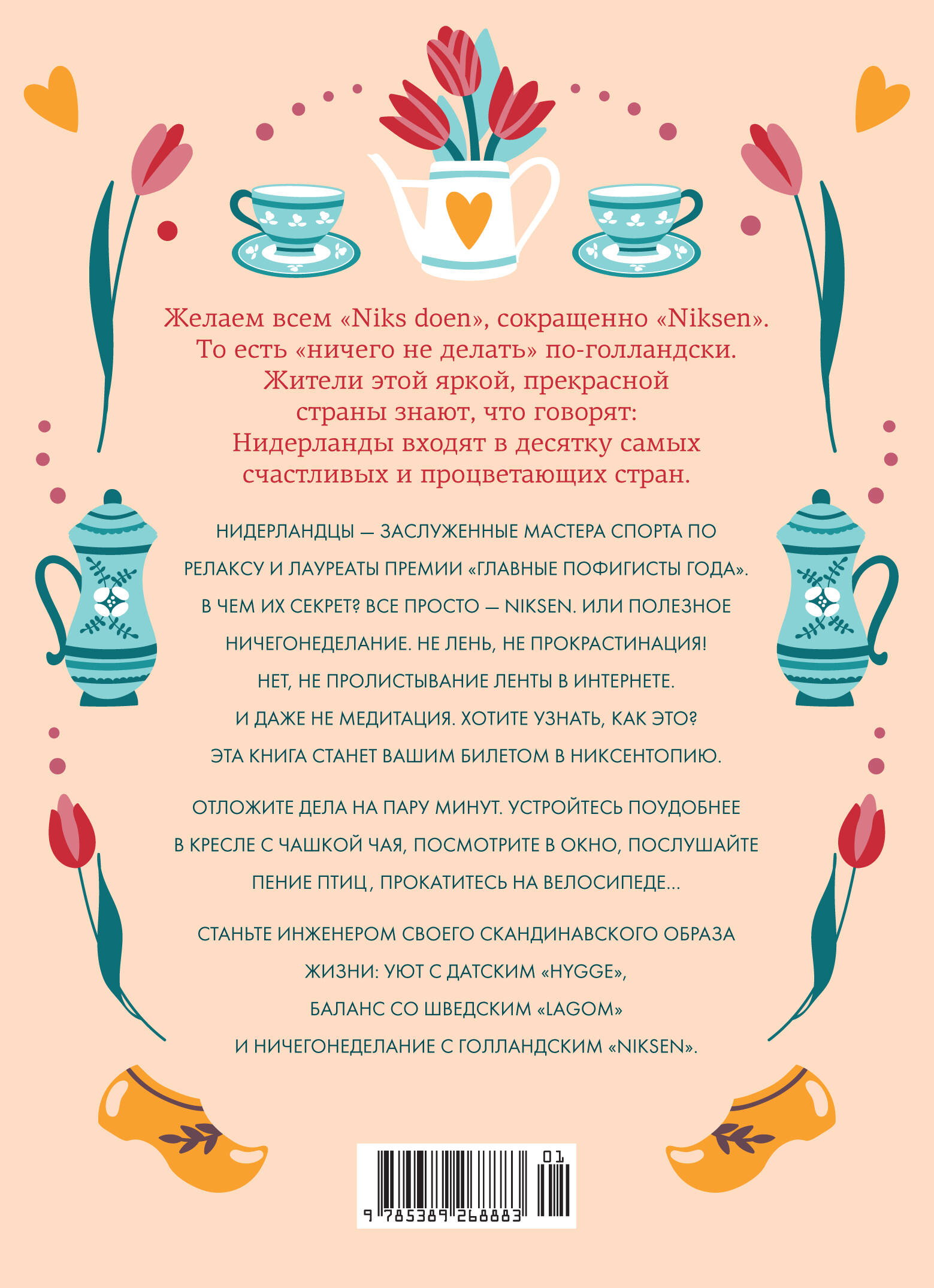 Книга выходит в новой суперобложке в стиле "Hygge". Нидерланды - одна из самых счастливых стран в Европе и в мире. Важная составляющая счастья и душевного здоровья голландцев - никсен, или искусство ничегонеделания. Этот "секрет национального счастья" глубоко укоренен в нидерландской культуре, но освоить его может каждый, независимо от этнической принадлежности, языка и места проживания. Для этого не требуется никаких вложений: вам не придется ничего покупать, менять себя, перестраивать свой дом, обновлять гардероб, учиться медитировать или садиться на диету. Все, что нужно, - ничего не делать! Чтобы разгадать загадку никсена, журналист, писатель и переводчик Ольга Меккинг провела всесторонние исследования, пообщалась с самыми разными экспертами - психологами, социологами, коучами, историками, культурологами, а также с самими голландцами и с теми, кто переехал в Нидерланды из других стран и осваивает национальные традиции на месте. В результате у нее получилась остроумная и практичная книга, предлагающая действенные инструменты для решения ежедневных проблем и улучшения качества жизни здесь и сейчас. Даже если вы очень занятой человек и ваши дни расписаны по минутам, Меккинг покажет, как находить время на никсен дома, на работе, в дороге, и поможет не только научиться расслабляться и отпускать лишнее, но и стать счастливее, здоровее и продуктивнее.| Издательство | Азбука-Аттикус Издат.группа ООО |