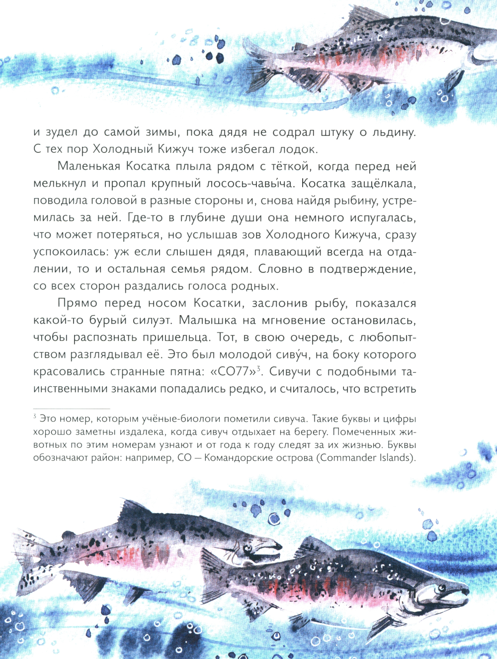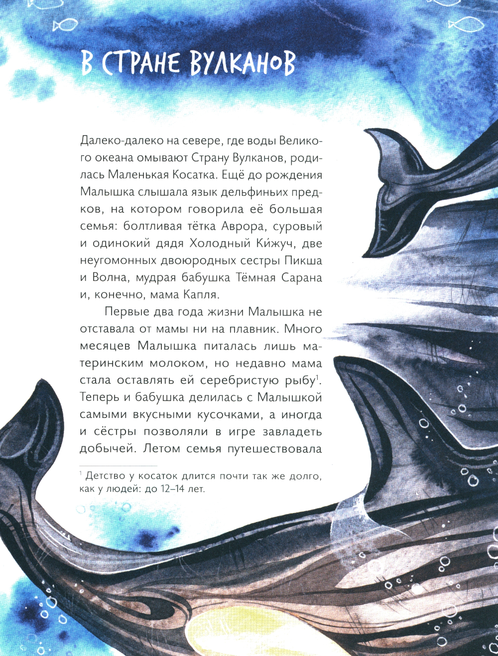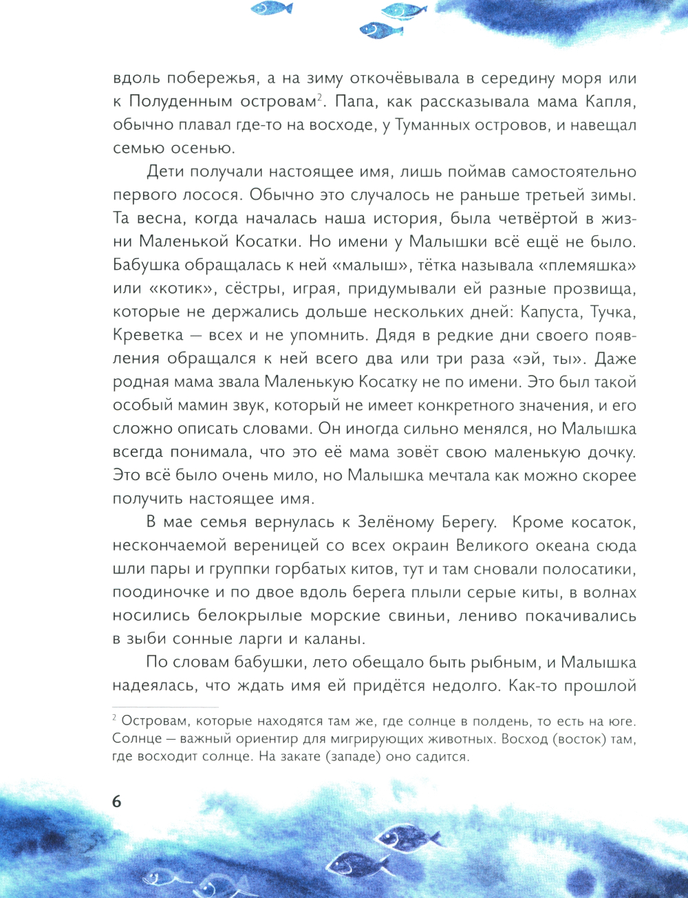 Маленькая Косатка появилась на свет далеко-далеко на севере, где воды Великого океана омывают Страну Вулканов. У неё не было настоящего имени - чтобы получить его, дети косаток должны самостоятельно поймать первого лосося. Однажды в погоне за юркой рыбиной Маленькая Косатка попала в сети рыболовного сейнера. Так началось её удивительное путешествие через восемь морей и три океана. В пути Маленькая Косатка подружилась с китом-горбачом, дельфинами-белобочками и афалинами, познакомилась с кашалотом, полосатыми дельфинами и даже нашла приёмную семью косаток. Но удалось ли ей вернуться к семье и получить имя?