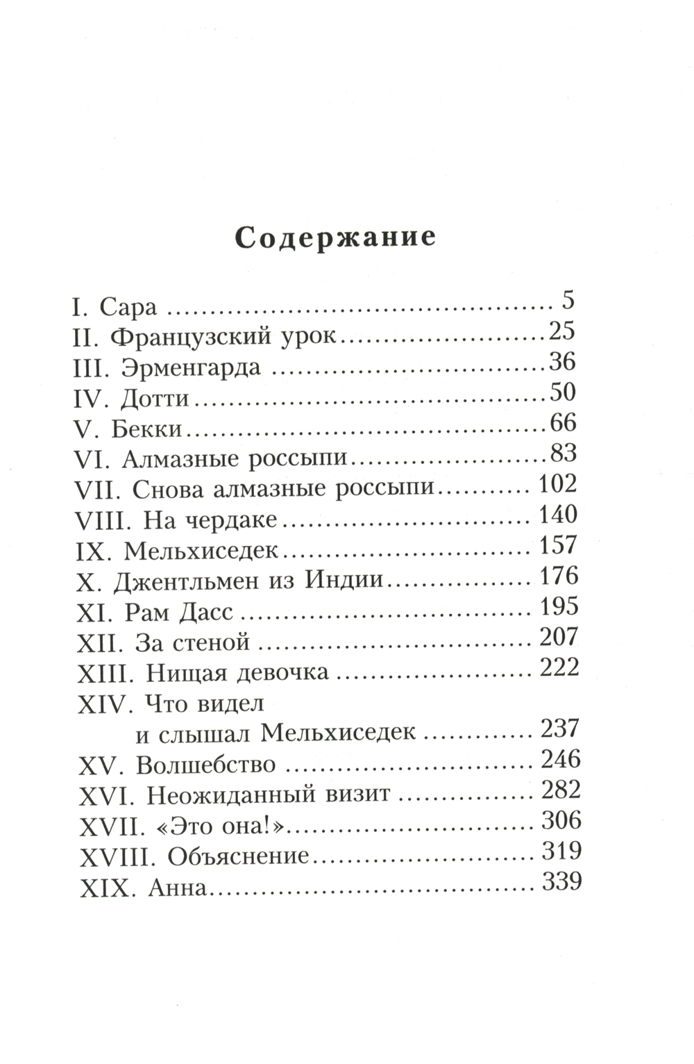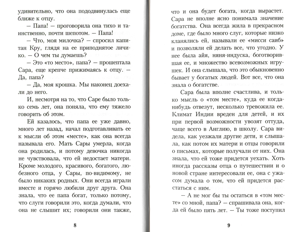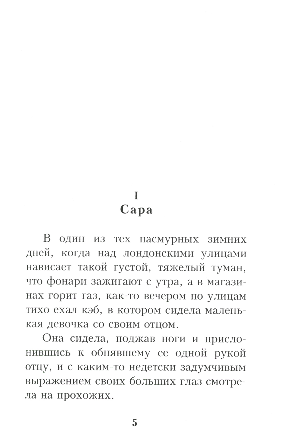 Лондон, конец 19 века. Капитан Кру привозит из далекой Индии свою маленькую дочь Сару - ей надо учиться. Девочку отдают в пансион, где всем заправляет злая директриса мисс Минчин, сразу невзлюбившая новую воспитанницу. Конечно, Сара никакая не принцесса. Просто у нее был очень состоятельный отец, богатое воображение, доброта и необыкновенное чувство собственного достоинства. Именно эти качества и спасли девочку после гибели капитана Кру, когда в одночасье она все потеряла.| Издательство | Клуб Семейного Досуга (Белгород) |