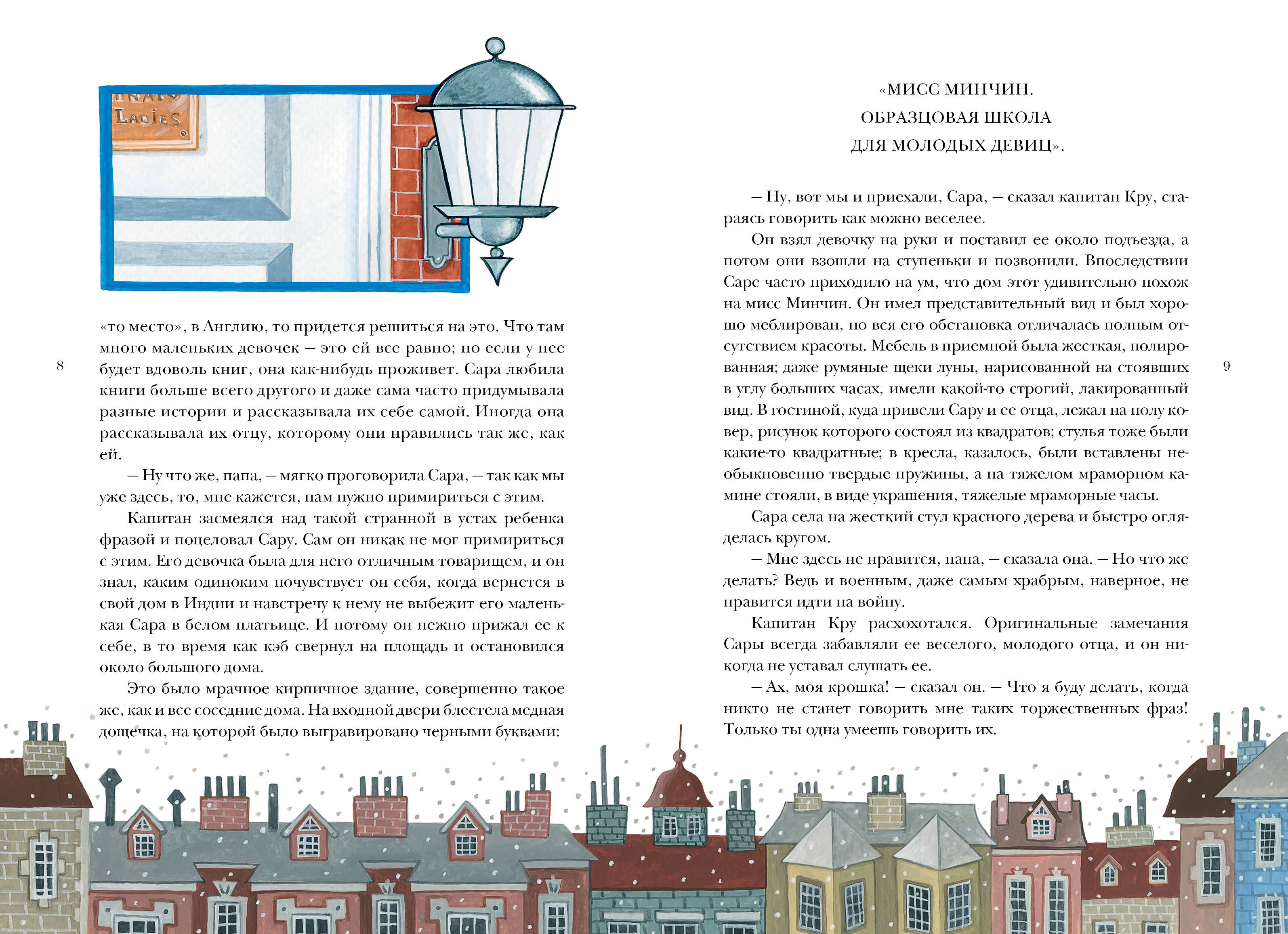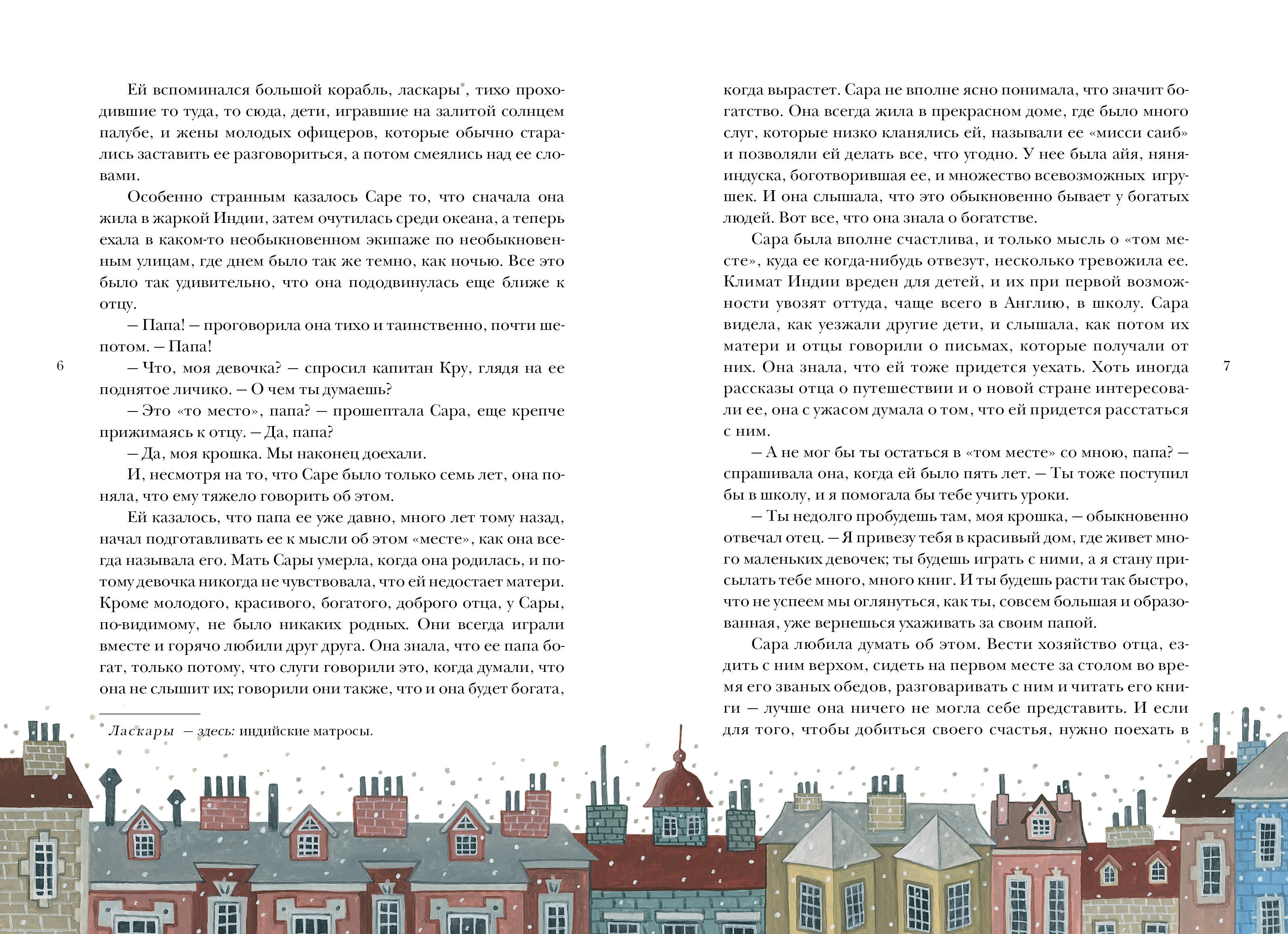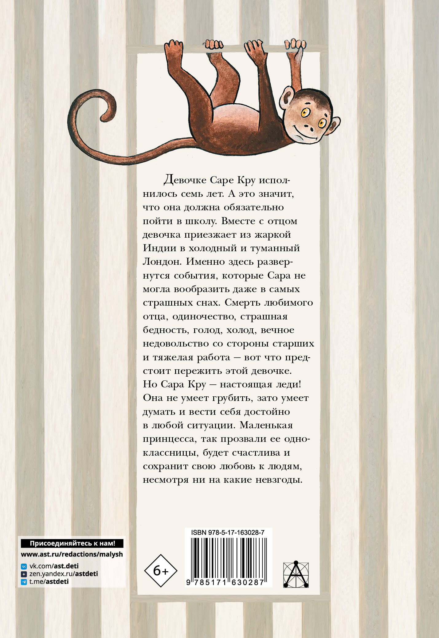 Девочке Саре Кру исполнилось семь лет. А это значит, что она должна обязательно пойти в школу. Вместе с отцом девочка приезжает из жаркой Индии в холодный и туманный Лондон. Именно здесь развернутся события, которые Сара не могла вообразить даже в самых страшных снах. Смерть любимого отца, одиночество, страшная бедность, голод, холод, вечное недовольство со стороны старших и тяжелая работа - вот что предстоит пережить этой девочке. Но Сара Кру - настоящая леди! Она не умеет грубить, зато умеет думать и вести себя достойно в любой ситуации. Маленькая принцесса, так прозвали ее одноклассницы, будет счастлива и сохранит свою любовь к людям, несмотря ни на какие невзгоды.| Издательство | Издательство "АСТ" |