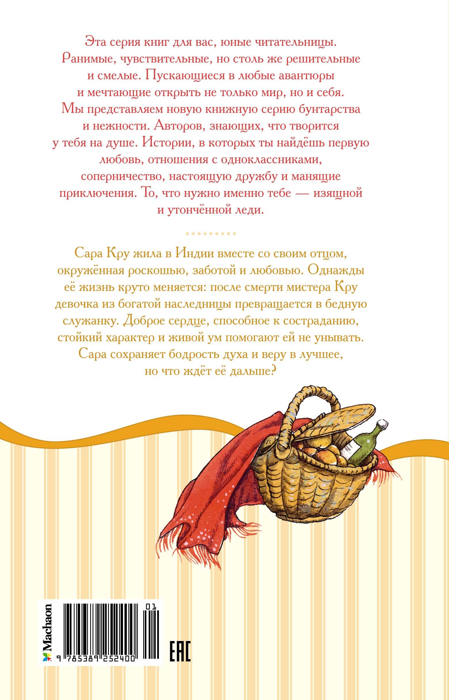 Сара Кру жила в Индии вместе со своим отцом, окружённая роскошью, заботой и любовью. Однажды её жизнь круто меняется: после смерти мистера Кру девочка из богатой наследницы превращается в бедную служанку. Доброе сердце, способное к состраданию, стойкий характер и живой ум помогают ей не унывать. Сара сохраняет бодрость духа и веру в лучшее, но что ждёт её дальше?| Издательство | Азбука-Аттикус Издат.группа ООО |