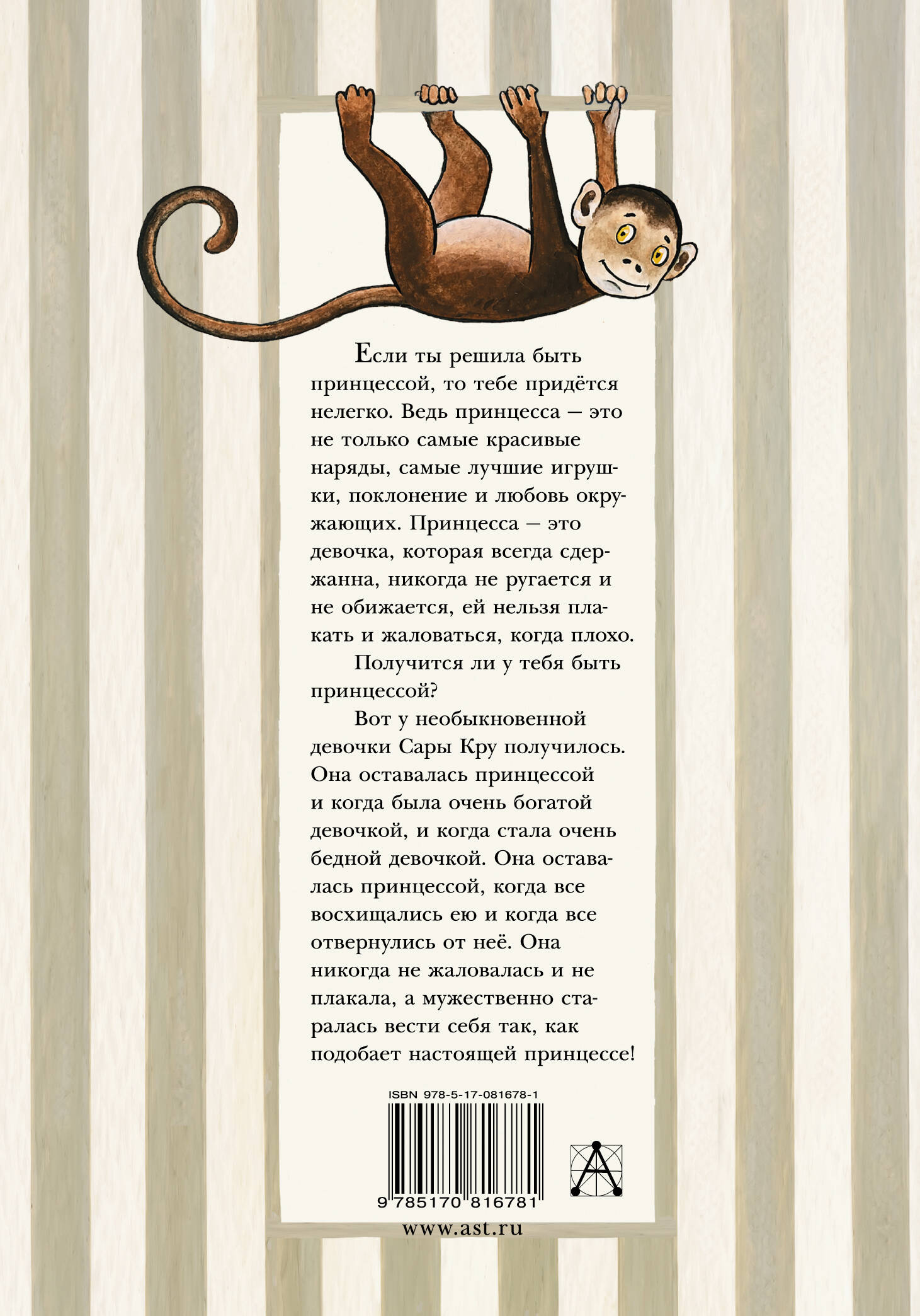 Если ты решила быть принцессой, то тебе придётся нелегко. Ведь принцесса - это не только самые красивые наряды, самые лучшие игрушки, поклонение и любовь окружающих. Принцесса - это девочка, которая всегда сдержанна, никогда не ругается и не обижается, ей нельзя плакать и жаловаться, когда плохо. Получится ли у тебя быть принцессой? Вот у необыкновенной девочки Сары Кру получилось. Она оставалась принцессой и когда была очень богатой девочкой, и когда стала очень бедной девочкой. Она оставалась принцессой, когда все восхищались ею и когда все отвернулись от неё. Она никогда не жаловалась и не плакала, а мужественно старалась вести себя так, как подобает настоящей принцессе!| Издательство | Издательство "АСТ" |