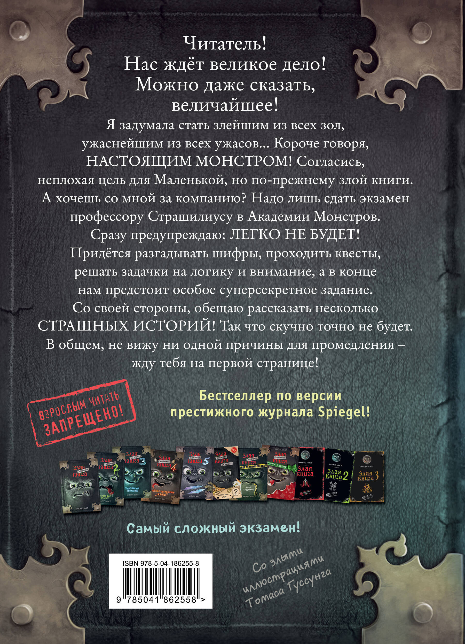 Плох тот солдат, который не хочет стать генералом! А «Маленькая злая книга» - которая не хочет стать просто «Злой книгой»! Или хотя бы монстром. Для начала. Но не всё так просто: нужно выдержать 5 испытаний на знание монстроведения. Юных читателей, как обычно, ждут заковыристые квесты, головоломки и страшно интересные истории, от которых не оторваться! Бестселлер по версии престижного журнала Spiegel.| Издательство | ООО "Издательство "Эксмо" |