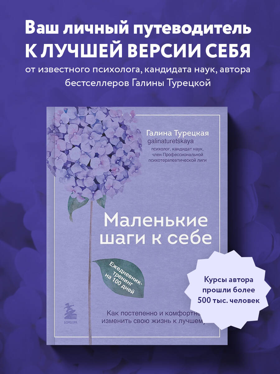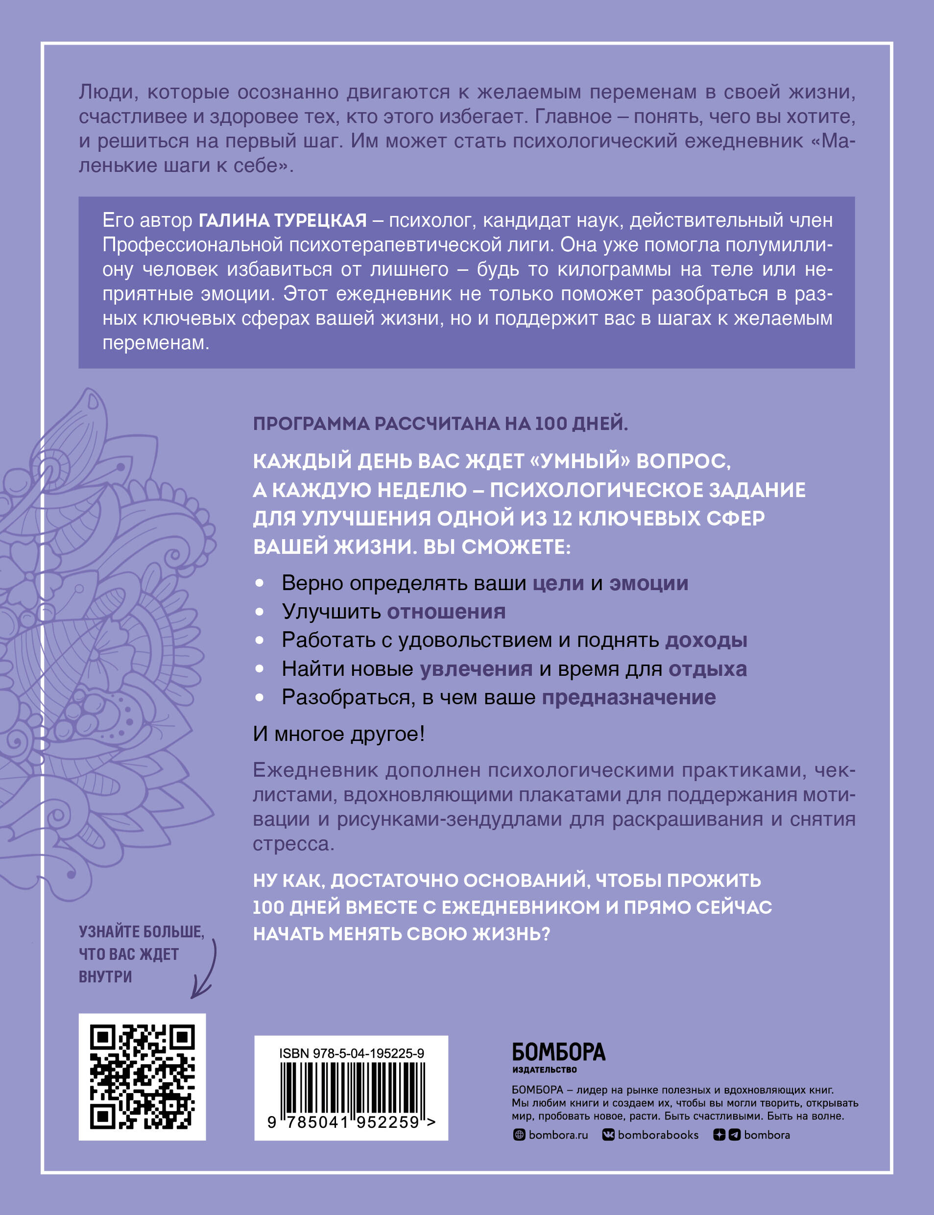 Доказанный факт: люди, которые принимают решение изменить свою жизнь, счастливее тех, кто избегает перемен. Но от абстрактного «хочу» до конкретного «меняю здесь и сейчас» могут пройти месяцы и даже годы, ведь одно дело - мечтать, а другое - брать и делать. На пути к цели может быть множество препятствий: внутренние переживания, боязнь перемен, недостаток бюджета и т.д. А неудовлетворенность и желание перемен продолжают подтачивать изнутри. Важно не побояться и сделать к ним первый шаг. Именно таким шагом и может стать психологический ежедневник Маленькие шаги к себе». Его автор Галина Турецкая - психолог, кандидат наук, член Профессиональной психотерапевтической лиги. Свою миссию она нашла в том, чтобы помогать людям избавляться от лишнего. Будь то килограммы на теле или неприятные эмоции. Этот ежедневник не только будет направлять вас по пути саморефлексии, но и поддержит вас в шагах к желаемым переменам. Программа рассчитана на 100 дней и состоит из 12 недельных блоков. Каждую неделю вы будете прорабатывать один из самых важных аспектов вашей жизни. Вы сможете: • Верно определять ваши цели и желания. • Работать с удовольствием и поднять доходы. • Осознанно относиться к своему телу и внешности. • Улучшить отношения. • Найти новые увлечения и время для отдыха. • Благодаря обратной связи от окружающих понять, что определяет вас как личность. • Разобраться, в чем ваше предназначение. Ежедневник также дополнен подборкой психологических практик, различными чек-листами, вдохновляющими цитатами и рисунками-зендудлами для раскрашивания и снятия стресса. Также внутри вас ждут QR-коды - по ним можно перейти в онлайн-версию, где собрано еще больше материала и полезных практик!| Издательство | ООО "Издательство "Эксмо" |