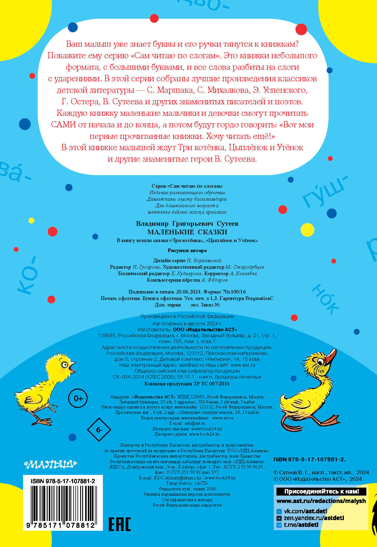 Ваш малыш уже знает буквы, и его ручки тянутся к книжкам? Дайте ему книжку из серии "Сам читаю по слогам". Эти книжки небольшого формата, с большими буквами, и все слова разбиты на слоги с ударениями. В этой серии собраны лучшие произведения классиков детской литературы - С. Маршака, С. Михалкова, Э. Успенского, Г. Остера, В. Сутеева и других знаменитых писателей и поэтов. Каждую книжку маленькие мальчики и девочки смогут прочитать САМИ от начала и до конца, а потом будут гордо говорить: "Вот мои первые прочитанные книжки. Хочу читать ещё!" В этой книжке малышей ждут Три котёнка, Цыплёнок и Утёнок и другие знаменитые герои В. Сутеева.| Издательство | ИЗДАТЕЛЬСТВО "АСТ" |