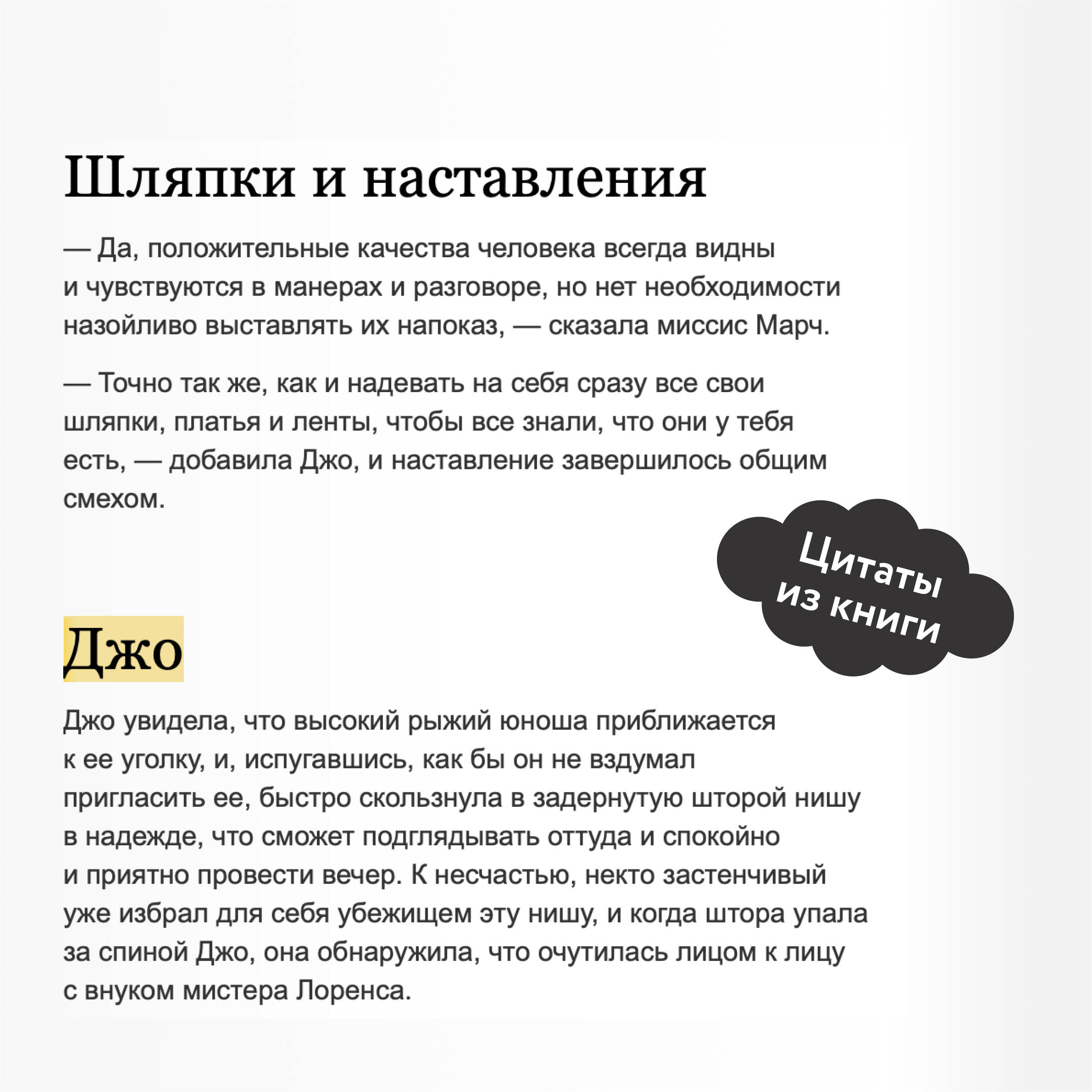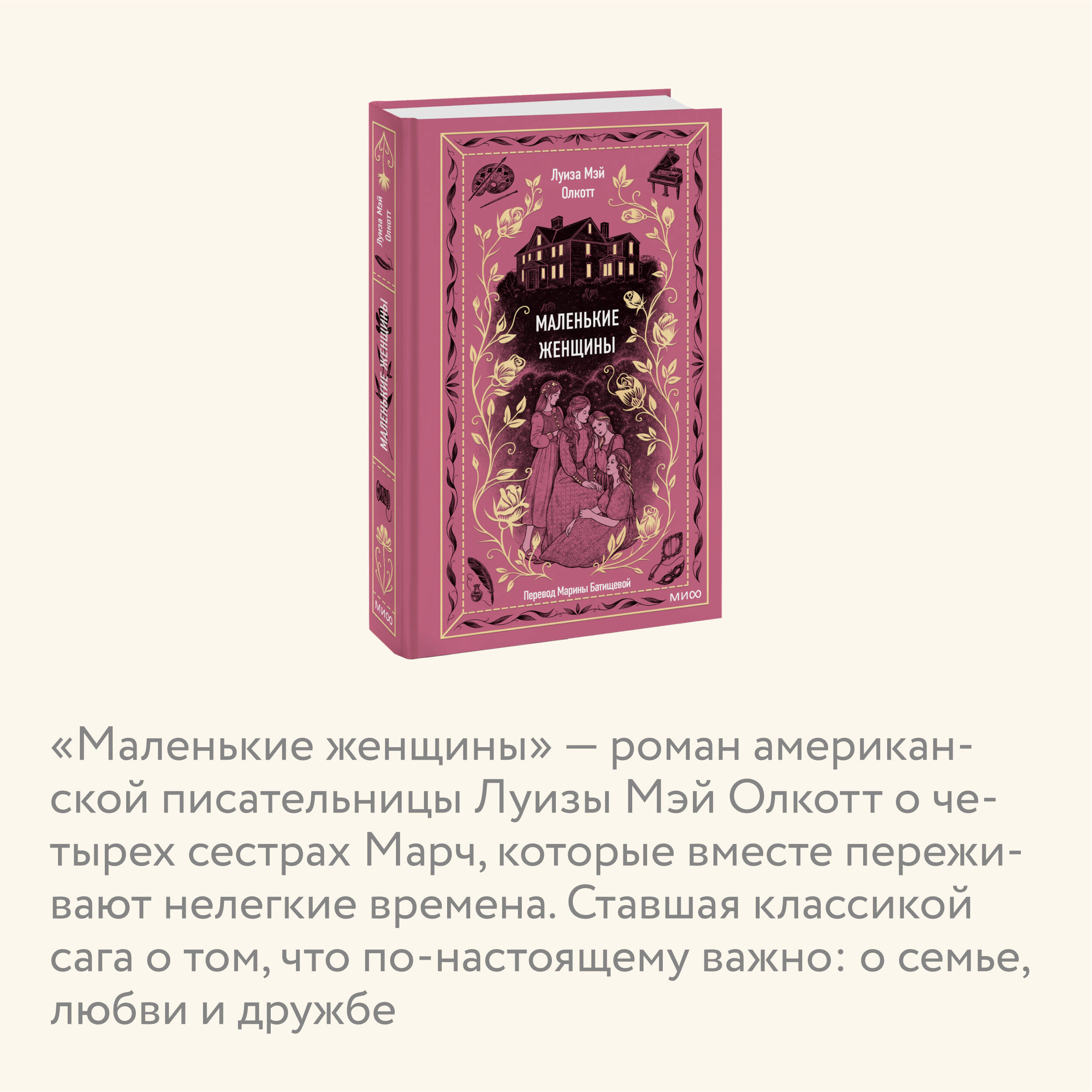"Маленькие женщины" - ставший классическим роман американской писательницы Луизы Мэй Олкотт о четырех сестрах Марч, которые вместе переживают нелегкие времена. Обратившись к воспоминаниям детства, писательница, выросшая в дружной, но небогатой семье, показывает читателю жизнь таких разных и все же близких друг другу девушек - Мег, Джо, Бесс и Эми. Каждая из них идет своим путем, но и в радостях, и в ссорах не забывает о том, что по-настоящему важно: о семье, любви и дружбе. "Как было бы здорово, если бы все воздушные замки, которые мы строим в мечтах, могли стать настоящими и в них можно было бы жить". Для кого эта книга: Для читателей классической литературы. Для тех, кому нравятся светлые и добрые истории. Для читателей, которые хотят иметь в своей библиотеке классические книги с красивыми обложками и качественной бумагой.
