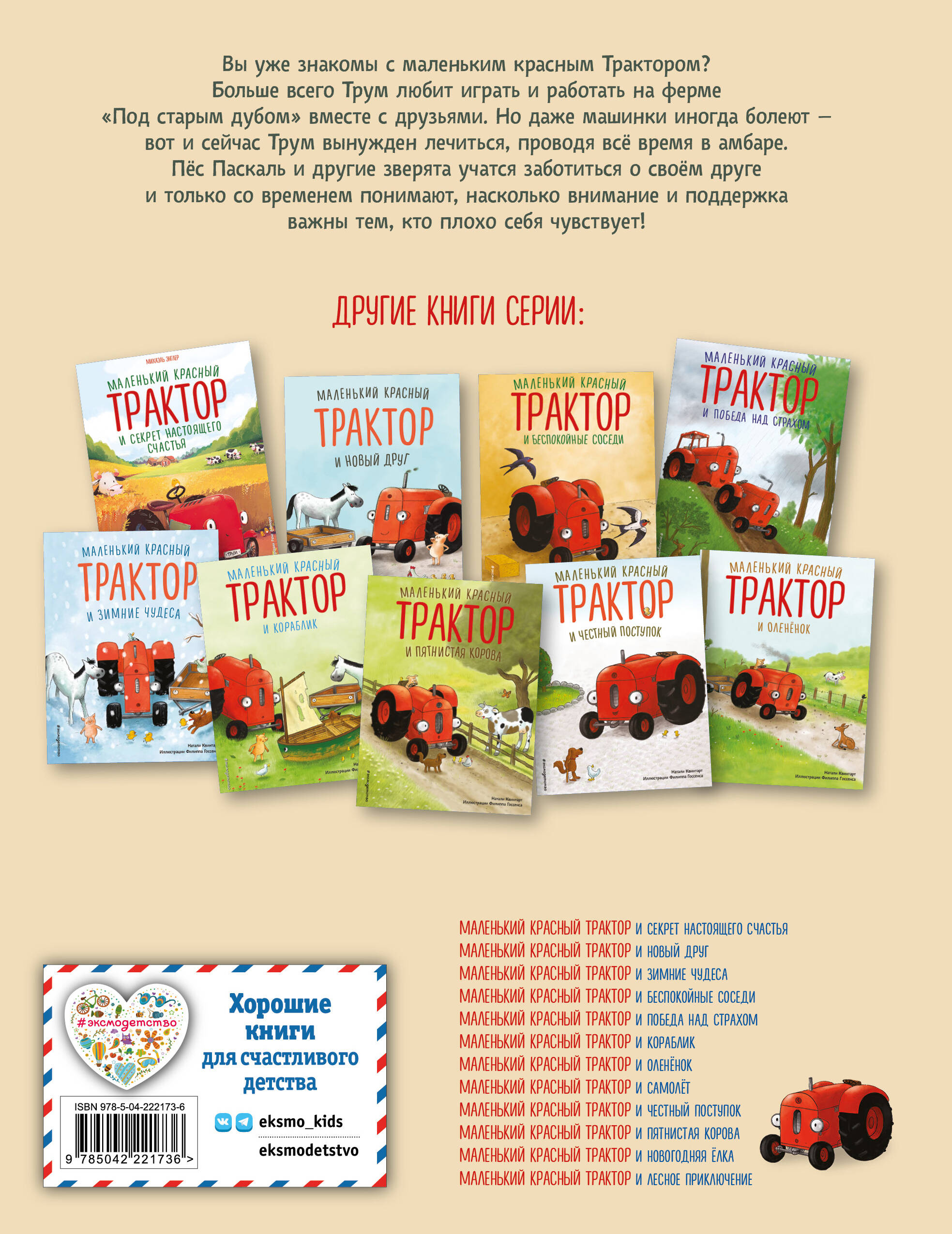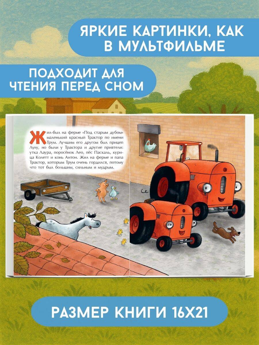 Добрая и увлекательная сказка о приключениях маленького красного Трактора и его друзей! Истории о понимании, взаимовыручке и настоящем счастье покорили сердца тысяч малышей. Когда маленький Трактор Трум заболевает, ему кажется, что мир про него забыл. Но в этой трогательной и поучительной истории герой осознаёт: настоящие друзья не оставят в беде. Этот рассказ - о заботе, терпении и дружбе, которая лечит не хуже любого лекарства. А выздоравливать всегда легче, если есть, на кого положиться! Издание с яркими иллюстрациями на каждой странице прекрасно подойдёт на подарок ребёнку. Замечательный вариант для первого чтения и сказки на ночь! Все книги серии особенно понравятся детям 3-4 лет.| Издательство | ООО "Издательство "Эксмо" |