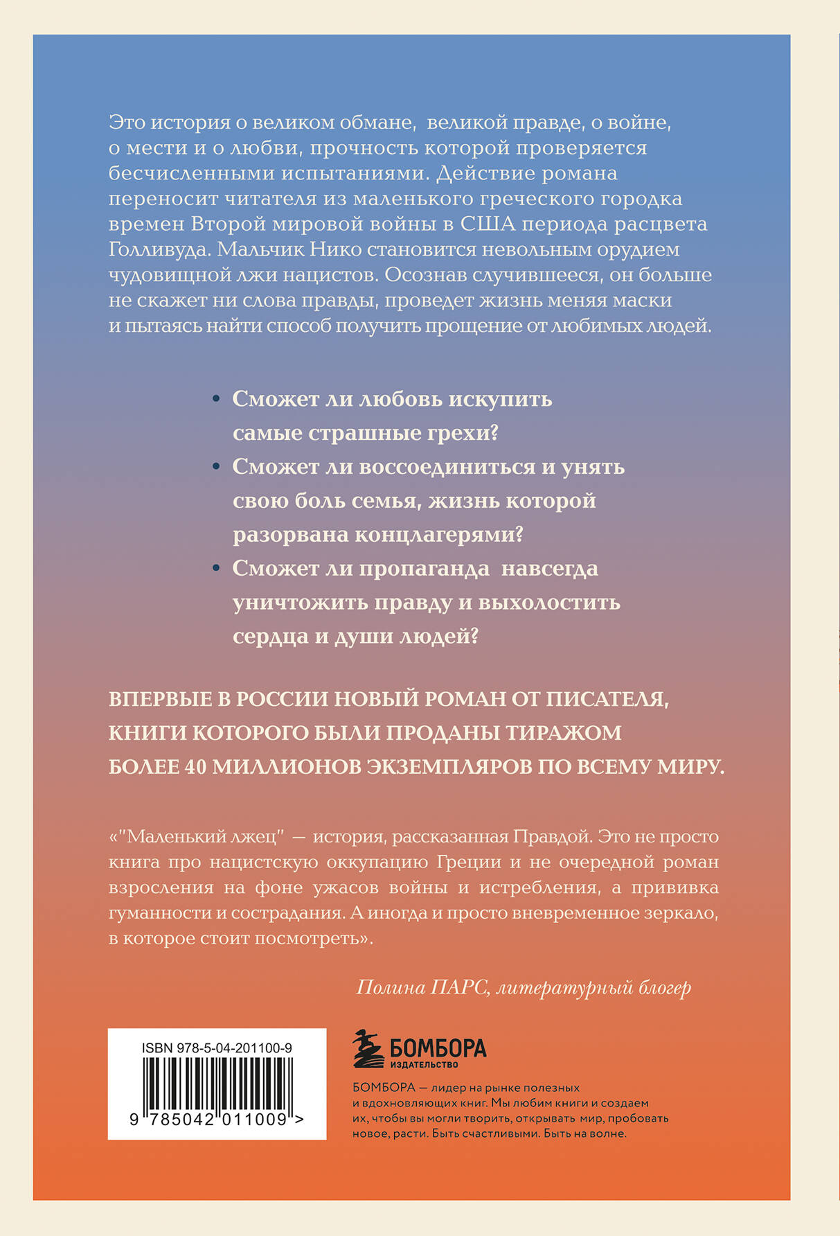 Это история о великом обмане, великой правде, о войне, о мести и о любви, прочность которой проверяется бесчисленными испытаниями. Действие романа переносит читателя из маленького греческого городка времен Второй мировой войны в США периода расцвета Голливуда. Мальчик Нико становится невольным орудием чудовищной лжи нацистов. Осознав случившееся, он больше не скажет ни слова правды, проведет жизнь, меняя маски и пытаясь найти способ получить прощение от любимых людей. Сможет ли любовь искупить самые страшные грехи? Сможет ли воссоединиться и унять свою боль семья, жизнь которой разорвана концлагерями? Сможет ли пропаганда навсегда уничтожить правду и выхолостить сердца и души людей? Впервые в России новый роман от писателя, книги которого были проданы тиражом более 40 миллионов экземпляров по всему миру. «"Маленький лжец" - это не только история о невинных жертвах нацизма и поломанных судьбах. Это увлекательнейшая семейная сага обо всех нас, тех, кто стремится любить и быть любимыми, тех, кто пытается отличить правду от лжи, тех, кто ищет свой путь к Белой башне (обители прощения, ради которого человек может пойти буквально на все). Роман не отпускает из своих объятий до последней страницы. И до последней страницы мы все еще будем сомневаться, в чем же все-таки сила - в правде или в том, что мы ей считаем?» - Анна Мясникова, руководитель группы креативных проектов «Бомбора» «"Маленький лжец" - это история, рассказанная Правдой. Это не просто книга про нацистскую оккупацию Греции и не очередной роман взросления на фоне ужасов войны и истребления, а прививка гуманности и сострадания. А иногда и просто вневременное зеркало, в которое стоит посмотреть». - Полина Парс, литературный блогер| Издательство | ООО "Издательство "Эксмо" |