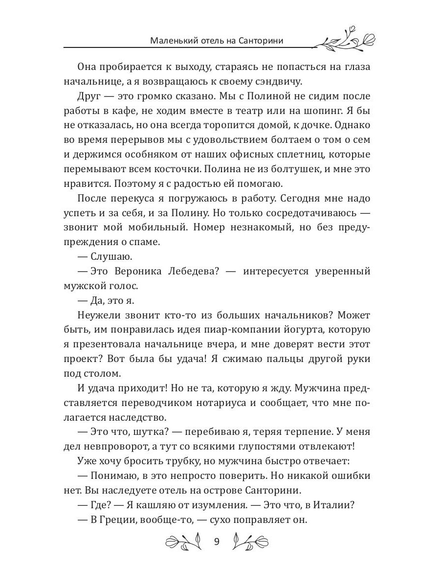 Ника получает в наследство маленький семейный отель на острове Санторини. Она летит в Грецию, планируя продать отель. Но с первого же дня влюбляется в живописный остров с белоснежными домиками, в очаровательный отель, который хранит семейные тайны, и в греческого художника. В Москве остались жених и карьера. Но отпустит ли ее райский остров? Что, если ее дом теперь здесь, под синим небом Санторини?| Издательство | Т8 RUGRAM |