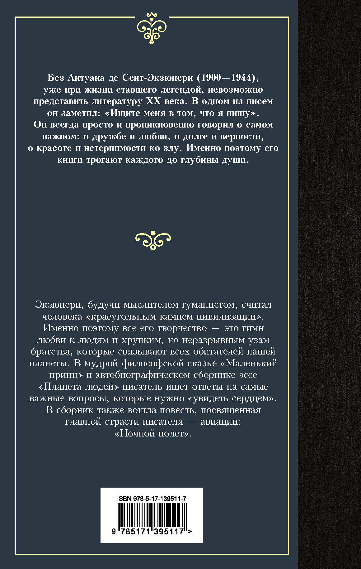 Без Антуана де Сент-Экзюпери (1900-1944), уже при жизни ставшего легендой, невозможно представить литературу ХХ века. В одном из писем он заметил: "Ищите меня в том, что я пишу". Он всегда просто и проникновенно говорил о самом важном: о дружбе и любви, о долге и верности, о красоте и нетерпимости ко злу. Именно поэтому его книги трогают каждого до глубины души. Экзюпери, будучи мыслителем-гуманистом, считал человека "краеугольным камнем цивилизации". Именно поэтому все его творчество - это гимн любви к людям и хрупким, но неразрывным узам братства, которые связывают всех обитателей нашей планеты. В мудрой философской сказке "Маленький принц" и автобиографическом сборнике эссе "Планета людей" писатель ищет ответы на самые важные вопросы, которые нужно "увидеть сердцем". В сборник также вошла повесть, посвященная главной страсти писателя - авиации: "Ночной полет".| Издательство | Издательство "АСТ" |