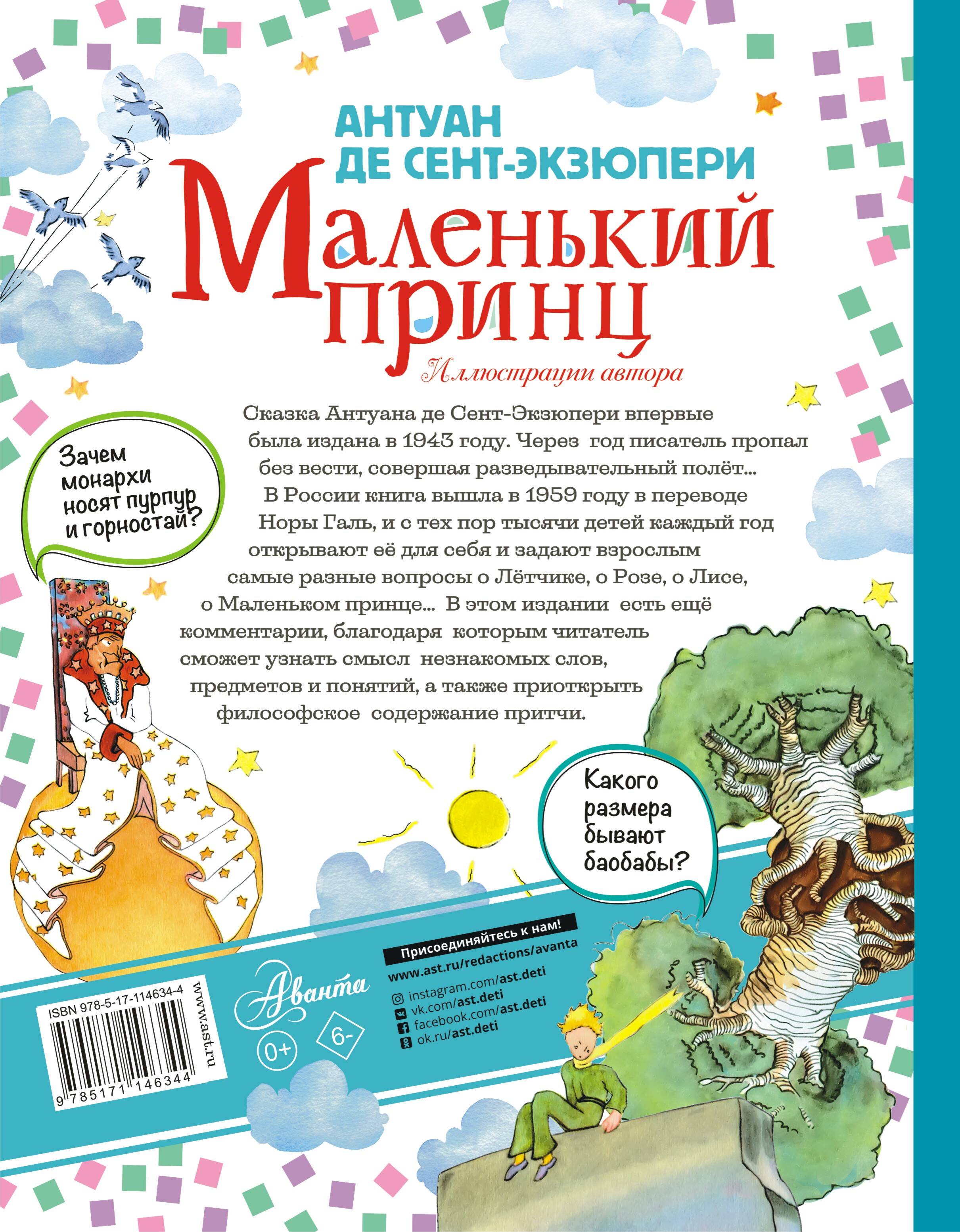 Сказка Антуана де Сент-Экзюпери «Маленький принц» впервые была издана в 1943 году. Через год писатель пропал без вести, совершая разведывательный полет... В России она вышла только в 1959 году в переводе Норы Галь, и с тех пор тысячи детей каждый год открывают ее для себя и задают взрослым самые разные вопросы о Летчике, о Розе, о Лисе, о Маленьком принце... В этом издании, кроме текста сказки и авторских рисунков к ней, есть еще комментарии, благодаря которым читатель сможет узнать смысл незнакомых слов, предметов и понятий, а также приоткрыть философское содержание притчи. Что такое баобаб? И какого размера они бывают? Кто такой честолюбец? И чем он отличается от тщеславного человека? Зачем нужны фонарщики и трубочисты? Есть ли они сегодня? Что такое вечное перо? Не им ли пишутся вечные книги? Почему астроном вынужден был снять турецкую одежду? Зачем монархи носят пурпур и горностай? Почему на рисунках Маленький принц всегда разный?