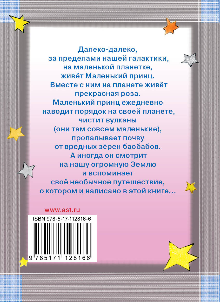 Далеко-далеко, за пределами нашей галактики, на маленькой планетке, живёт Маленький принц. Вместе с ним на планете живёт прекрасная роза. Маленький принц ежедневно наводит порядок на своей планете, чистит вулканы (они там совсем маленькие), пропалывает почву от вредных зёрен баобабов. А иногда он смотрит на нашу огромную землю и вспоминает своё необычное путешествие, о котором и написано в этой книге...| Издательство | ИЗДАТЕЛЬСТВО "АСТ" |