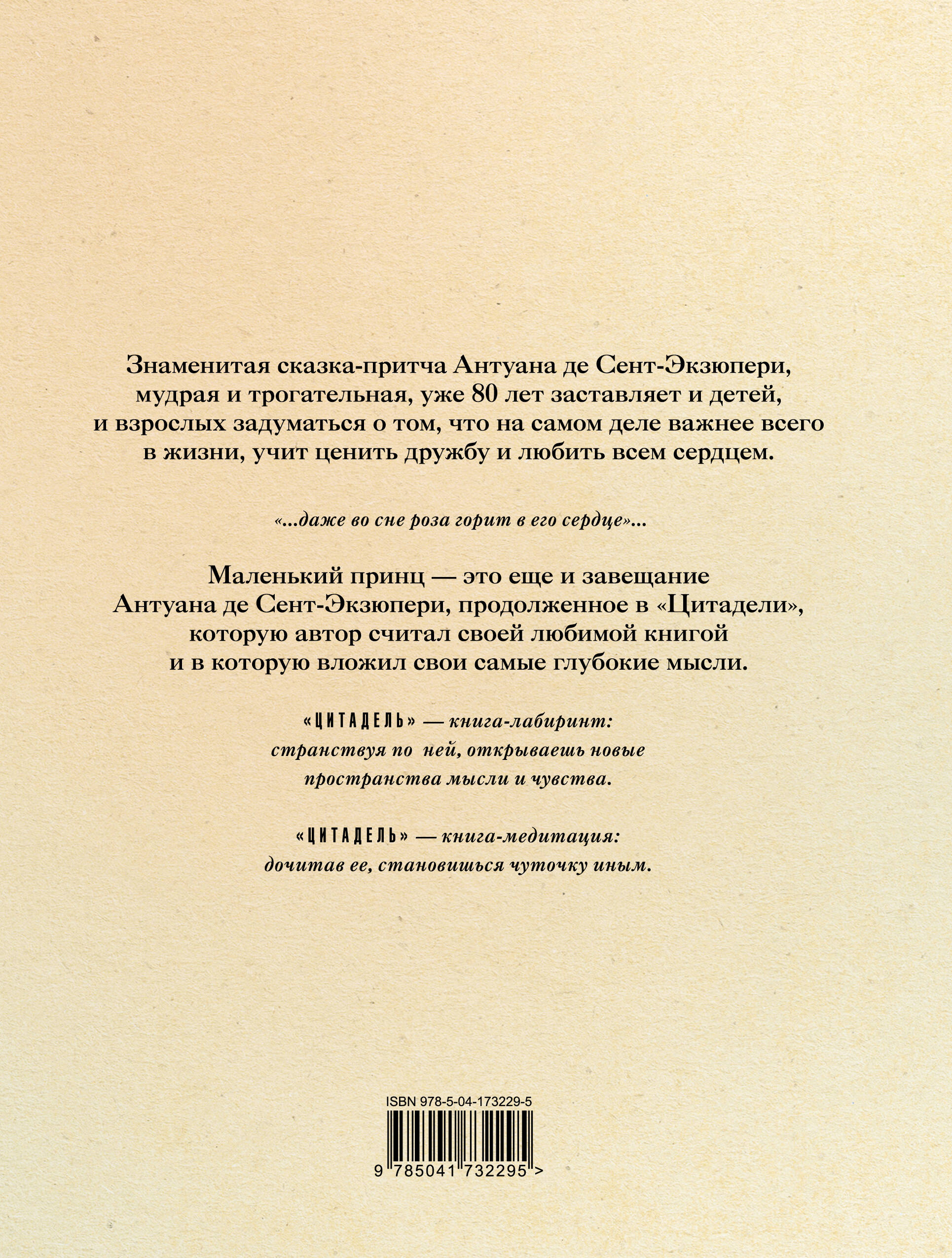 Юбилейное издание «Маленького Принца» с цветными рисунками Антуана де Сент-Экзюпери. 6 апреля 1943 года в издательстве «Рейнал-Хичкок», Соединенные Штаты Америки, книга вышла впервые. Знаменитая сказка-притча Антуана де Сент-Экзюпери, мудрая и трогательная, уже 80 лет заставляет и детей, и взрослых задуматься о том, что на самом деле важнее всего в жизни, учит ценить дружбу и любить всем сердцем. «...даже во сне, роза горит в его сердце»... Маленький принц любит, принадлежит любви и принимает ради нее смерть. Это произведение ярко вспыхнуло в литературе двадцатого века и остается живым до сегодняшнего дня. «Цитадель» - книга-лабиринт: странствуя по ней, открываешь новые пространства мысли и чувства. «Цитадель» - книга-медитация: дочитав ее, становишься чуточку иным. «Ты пишешь, ты обращаешься к людям, ты словно бы снаряжаешь корабль, - написал Сент-Экзюпери в "Цитадели". - Не многие из кораблей достигнут гавани. Большинство затеряется в море. Не так уж много значимых слов продолжают плыть по реке истории». «Цитадель» - произведение плоть от плоти автора, его сокровенное. Это та мелодия, тот сумрачный и торжественный гимн, что возник не благодаря какой-либо встрече, а постоянно звучал в его душе, был им самим, как дыхание, биение сердца, пульсация крови. «Цитадель», хоть и строится как рассказ, распадается на множество не связанных одна с другой историй, которые возбуждают не любопытство, не интерес, а восхищают красотой и значимостью.| Издательство | ООО "Издательство "Эксмо" |