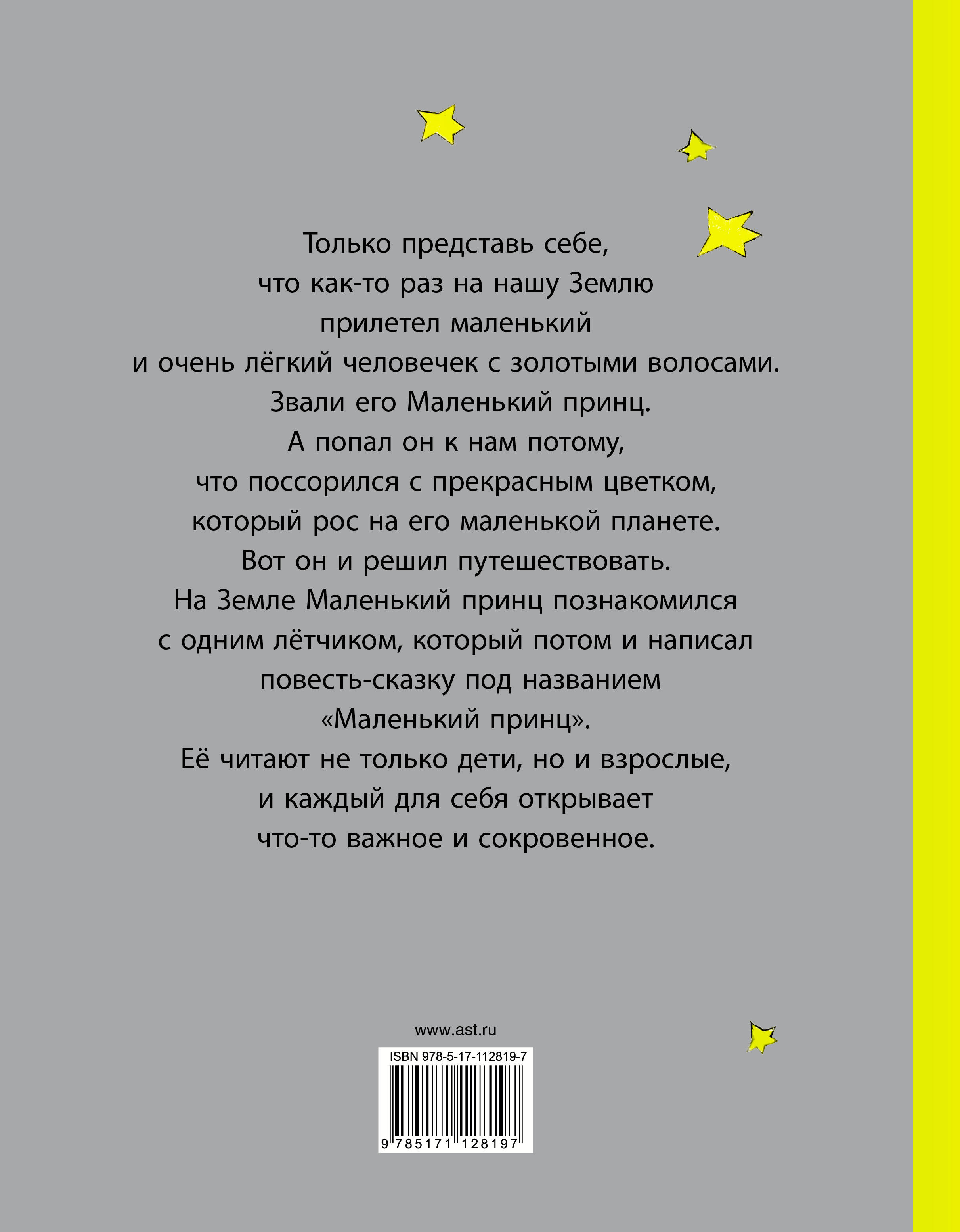 Только представь себе, что как-то раз на нашу Землю прилетел маленький и очень лёгкий человечек с золотыми волосами. Звали его Маленький принц. А попал он к нам потому, что поссорился с прекрасным цветком, который рос на его маленькой планете. Вот он и решил путешествовать. На Земле Маленький принц познакомился с одним лётчиком, который потом и написал повесть-сказку под названием «Маленький принц». Её читают не только дети, но и взрослые, и каждый для себя открывает что-то важное и сокровенное.| Издательство | Издательство "АСТ" |