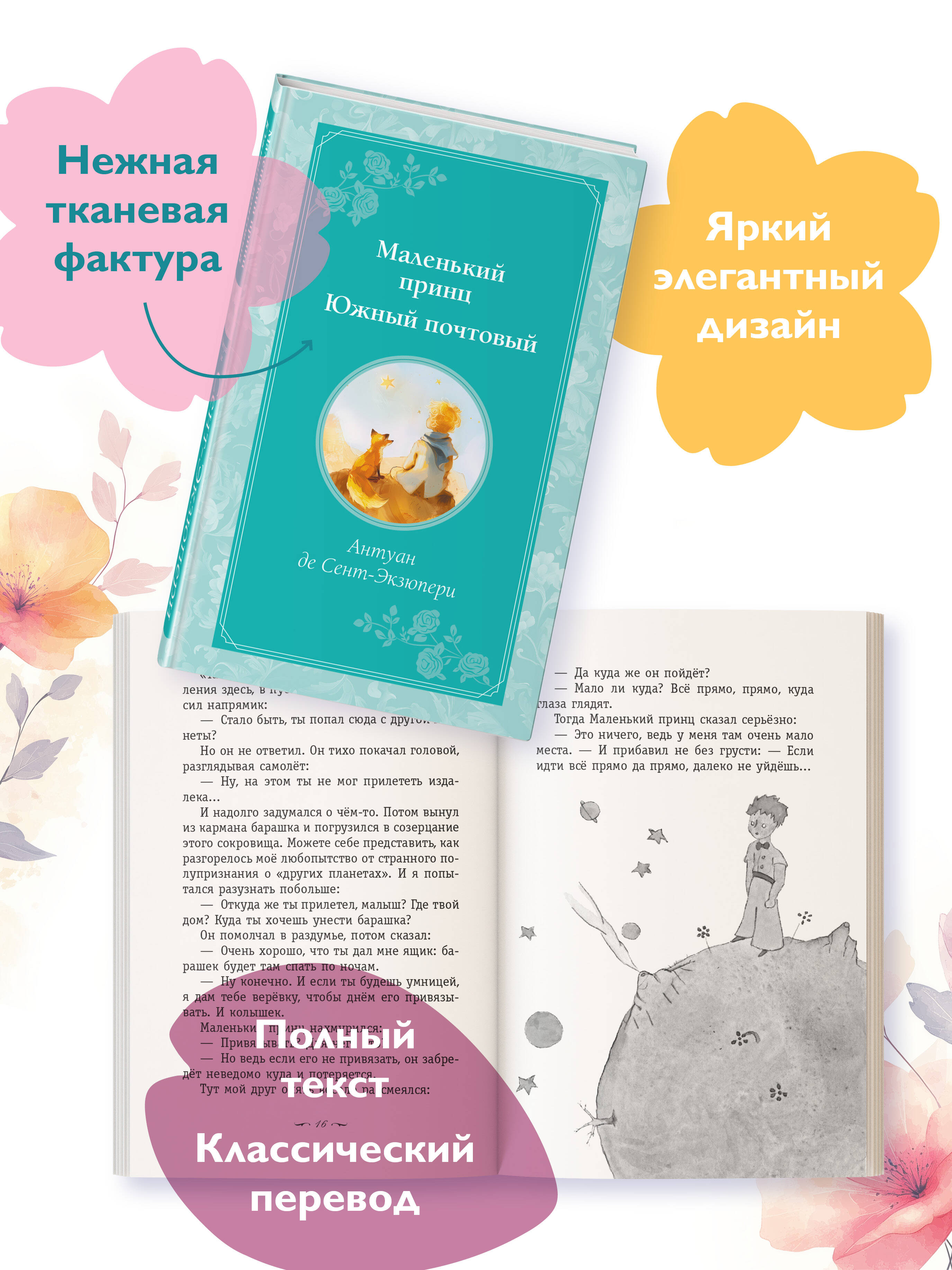 Изящное издание удобного формата. Твёрдый, приятный на ощупь переплёт с выпуклыми элементами. Оригинальный дизайн. Белая бумага. Чёткий, крупный шрифт. Чёрно-белые иллюстрации. В книгу вошли две повести Антуана де Сент-Экзюпери: «Маленький принц» и «Южный почтовый». Между этими произведениями - 14 лет и целая жизнь. Первая повесть писателя «Южный почтовый» - это грустная история любви, соперничества, утрат и вечных поисков себя. Но в слегка неровном, то лиричном, то почти документальном повествовании мы встречаем знакомые мысли: «Для нас истинные расстояния измеряются звёздами», «На свете нет ничего более хрупкого, чем надежда», «Я любил жизнь, которую не до конца понимал. Может, она была не совсем настоящая?» И нам уже кажется, что это Жак Бернис ушёл далеко в пустыню, чтобы спустя 14 лет встретить там золотоволосого мальчика с далёкой звезды и до конца понять жизнь, которую он так любил.| Издательство | ООО "Издательство "Эксмо" |