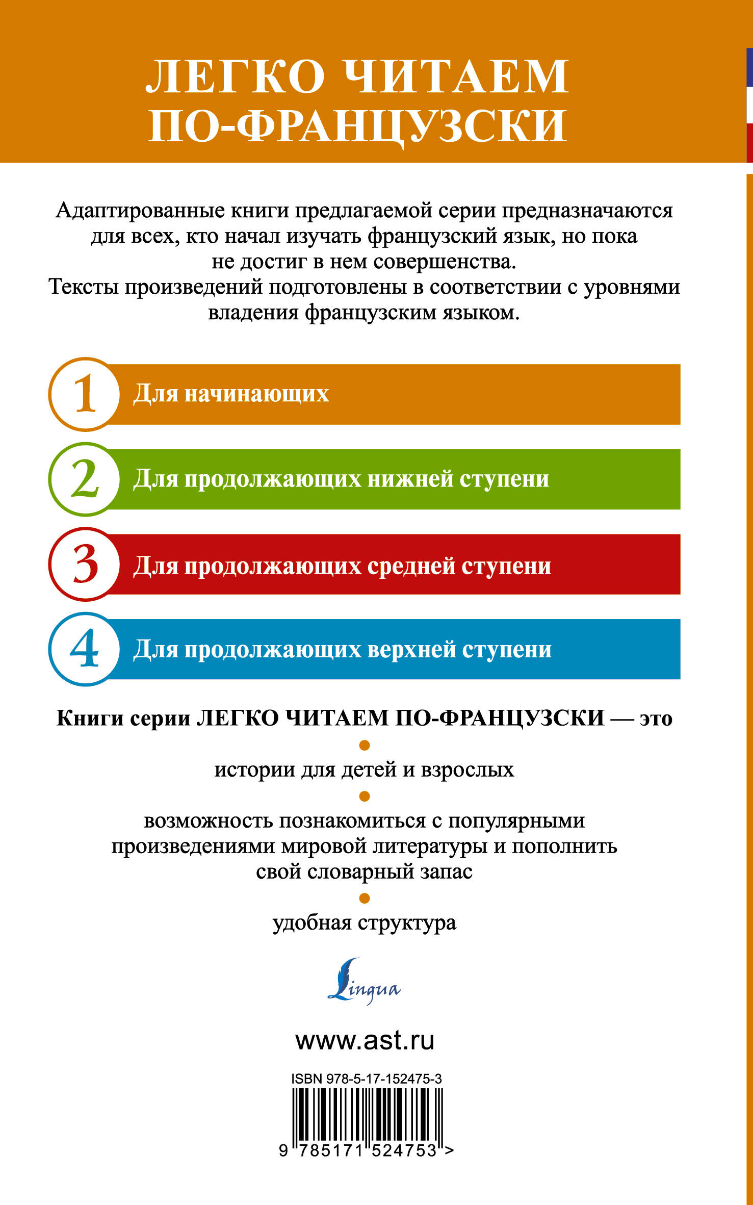 Если вы только начинаете учить французский язык, обязательно прочтите это потрясающее произведение на языке оригинала. "Маленький принц" - одно из самых известных и любимых читателями произведений французского писателя Антуана де Сент-Экзюпери. Сказка позволяет задуматься о таких серьезных темах, как любовь, дружба, ответственность. На протяжении всей книги автор напоминает, как важно "сохранить в себе ребенка" и, взрослея, не забывать о своих мечтах и талантах, ведь дети удивительны, они полны идей, их фантазия безгранична, пока взрослые не научат их думать "правильно". Это издание подойдет для начинающих, так как все сложные речевые обороты и выражения поясняются. У вас есть возможность прочитать эту трогательную историю в оригинале, получая удовольствие от лёгкого и изящного стиля писателя. Читайте, пополняйте словарный запас и параллельно закрепляйте знания языка, выполняя упражнения после каждой главы. Найдите в книге эти всемирноизвестные остроумные цитаты на французском языке: "Ты навсегда в ответе за всех, кого приручил". "Глаза слепы. Искать надо сердцем". "Это очень печально, когда забывают друзей".| Издательство | ИЗДАТЕЛЬСТВО "АСТ" |