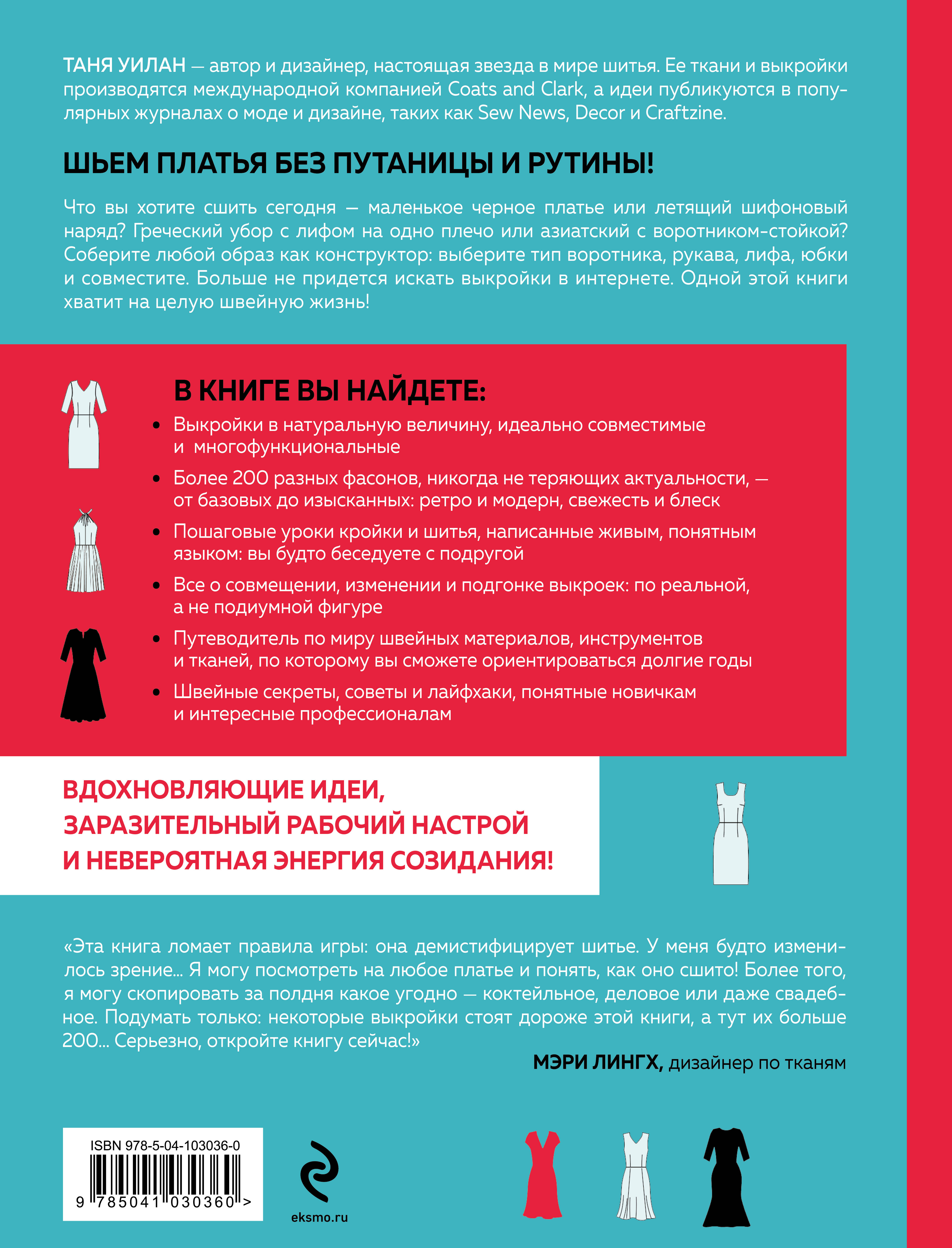 «Эта книга - прекрасный универсальный ресурс, который должен быть у каждой швеи. В подростковом возрасте я бы спала с ней под подушкой! Если вы новичок в шитье, вам нужна эта книга. Если вы опытный мастер, вам нужна эта книга. Все, кто шьет - поставьте эту книгу на полку!» Эми Смит, блогер Этот уникальный бестселлер из Европы содержит в себе более 200 моделей платьев. Его автор Таня Уилан - настоящая звезда в мире шитья. Под ее руководством вы научитесь шить любые платья, собирая образ как конструктор. Больше не придется искать и покупать выкройки. Просто выберите тип воротника, рукава, лифа, юбки - и совместите. В книге вы найдете: • Выкройки в натуральную величину. • Более 200 разных фасонов. • Пошаговые уроки кройки и шитья, написанные живым понятным языком: вы будто беседуете с подругой. • Все о совмещении, изменении и подгонке выкроек: по реальной, а не подиумной фигуре. • Путеводитель по миру швейных материалов, инструментов и тканей. • Швейные секреты, советы и лайфхаки, понятные новичкам и интересные профессионалам. Совместите. Сшейте. Подгоните по фигуре. Таня Уилан знает, как сделать это быстро и легко. Это настоящий подарок каждой швее!| Издательство | ООО "Издательство "Эксмо" |