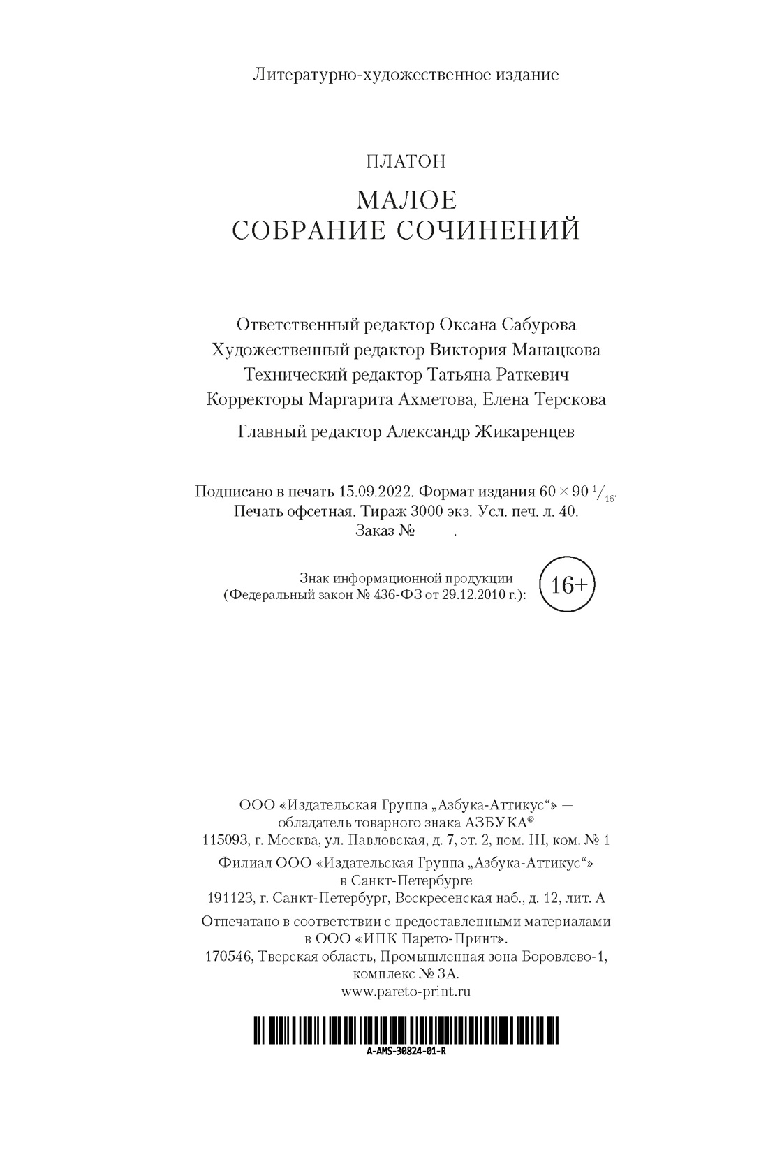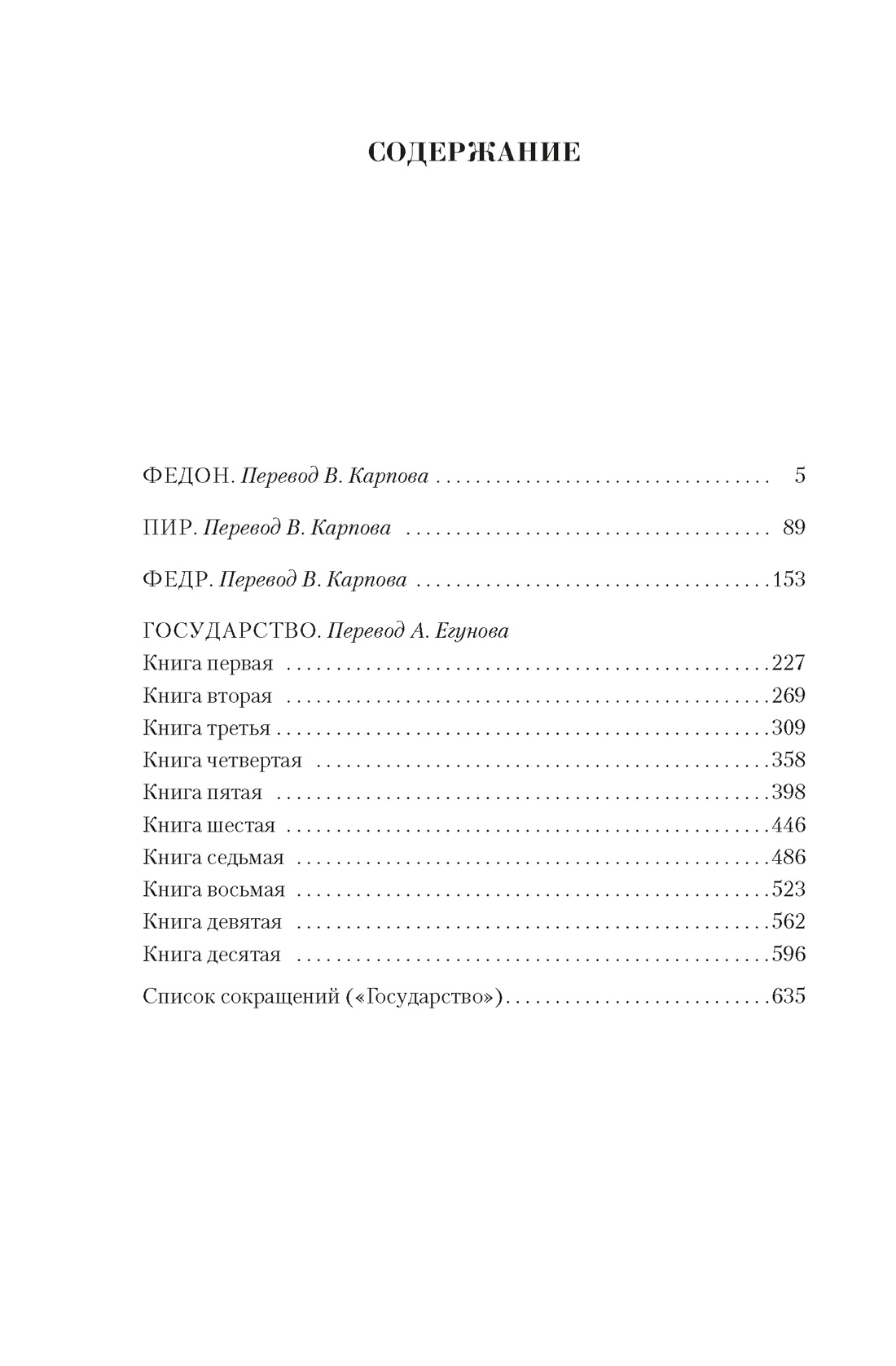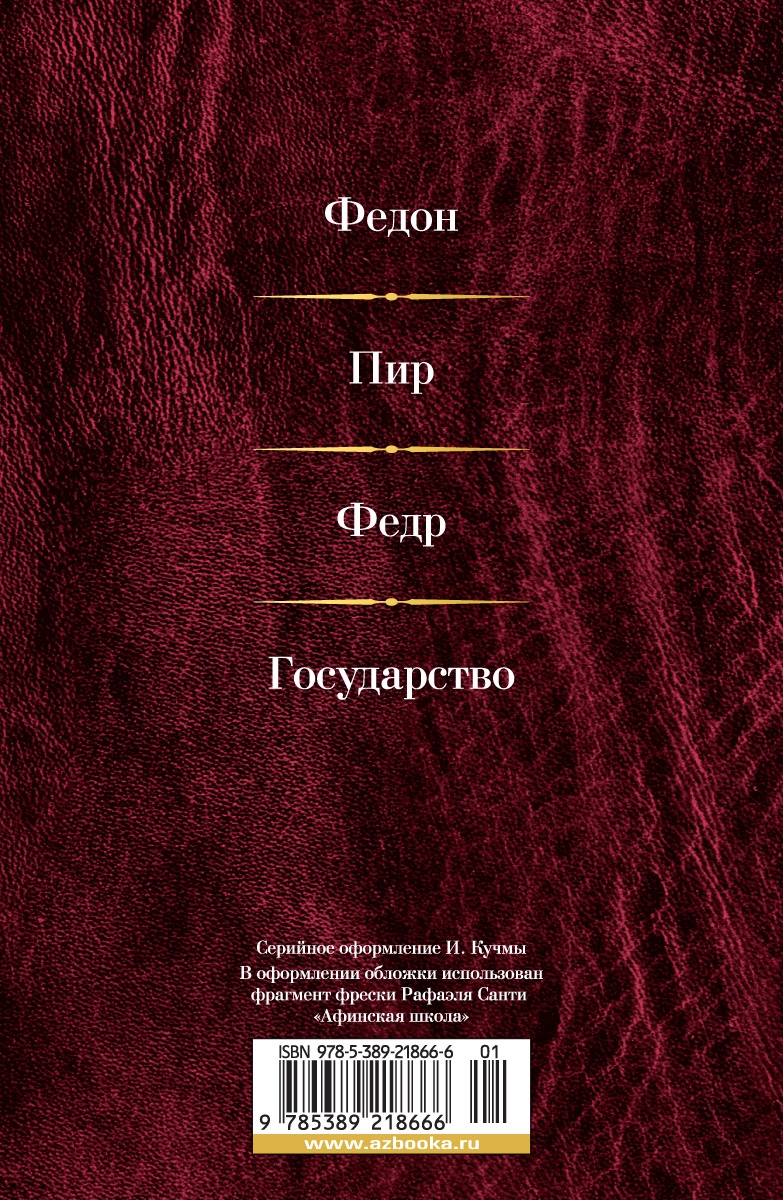 Платон - великий древнегреческий философ, идеи которого оказали огромное влияние на формирование человеческого духа и культуры человеческой мысли последующих столетий. Именно с него, ученика Сократа и учителя Аристотеля, начинается формирование строгого научного мышления. В настоящем издании читателю предлагаются избранные диалоги: «Федон», «Пир», «Федр» и «Государство». В первых трех диалогах затрагивается несколько больших тем: природа философского знания, этическая доктрина в связи с доказательствами бессмертия души и любовь как сила, обращающая личность к познанию и делающая ее богоподобной. В знаменитом «Государстве» философ определяет понятие справедливости, а также рассматривает шесть форм государственного правления - монархию, аристократию, тимократию, олигархию, демократию и тиранию - и дает описание идеального государства, которое управляется философами, «так как только мудрые могут нести заботу о правильном образе жизни всех граждан».| Издательство | Азбука |