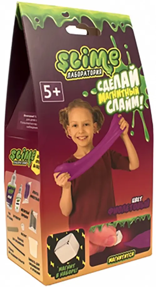 Создай своими руками необыкновенный магнитный слайм, наделённый суперсилой, пластичностью и эластичностью. Из него можно выдувать пузыри, используя трубочку из набора. Если растянуть слайм и поставить под струю воды, завернув уголки, то он сможет держать жидкость как шарик. А если поднести к магнит, то он будет тянуться к нему.