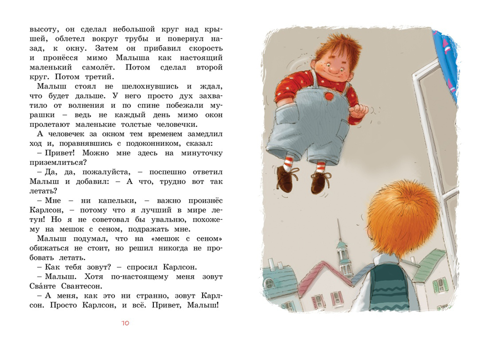 Представьте, что однажды мимо вашего окна с жужжанием пролетит маленький толстенький человечек с моторчиком и пропеллером на спине и скажет: «Привет! Можно мне здесь на минуточку приземлиться?» Именно так познакомились герои одной из самых популярных детских книжек - Малыш и Карлсон, который живёт на крыше. А написала её Астрид Линдгрен, замечательная шведская писательница, автор тридцати книг для детей, переведённых почти на все языки мира. Они удостоены самых престижных премий, в том числе золотой медали Андерсена («малой Нобелевской»), по ним сняты художественные и мультипликационные фильмы, поставлены театральные спектакли.| Издательство | Азбука |