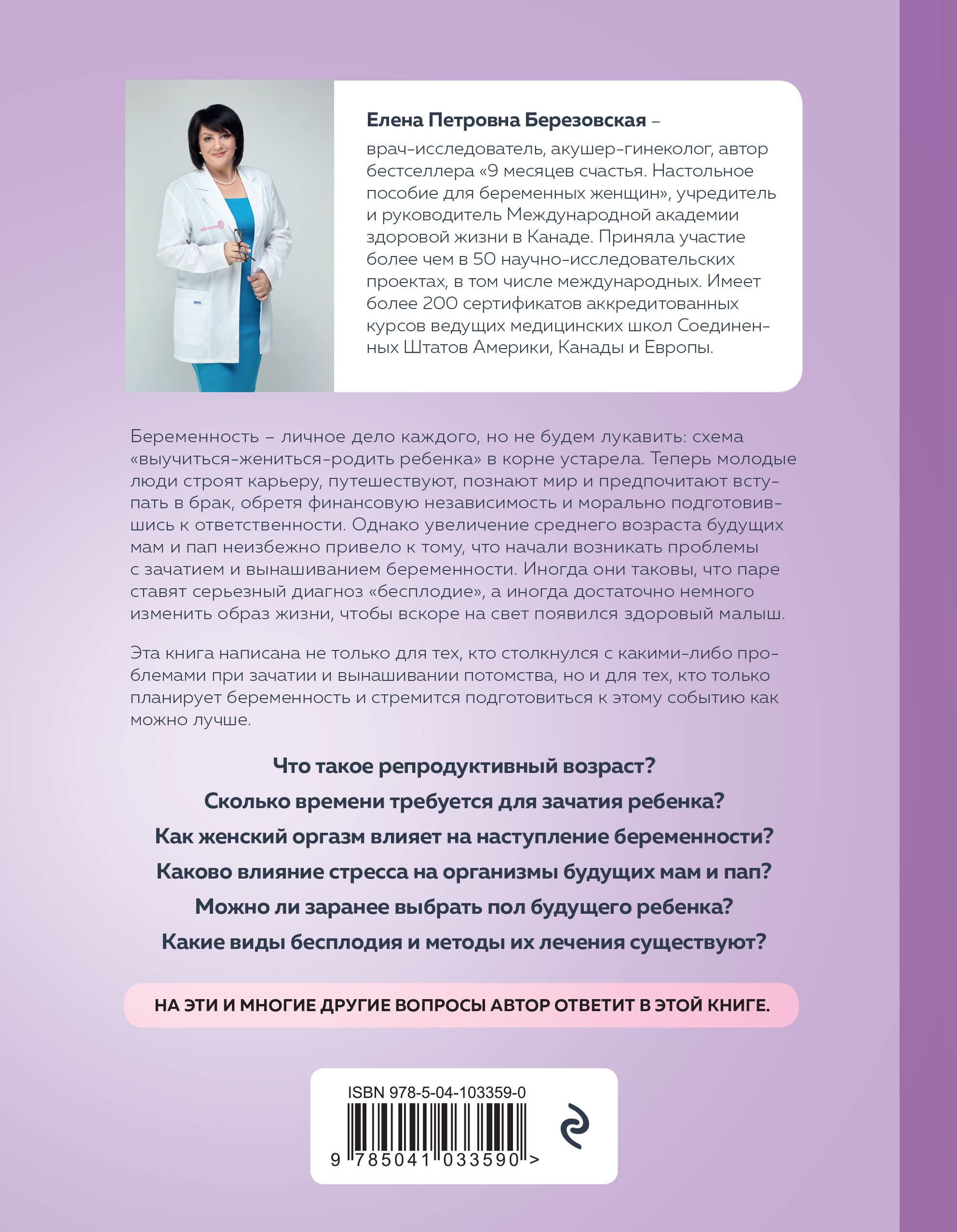 Подготовка к беременности - ​дело серьезное и иногда требует много времени и усилий как со стороны женщины, так и со стороны мужчины, ведь средний возраст будущих родителей все увеличивается. С одной стороны, это помогает принять более взвешенное решение о рождении ребенка, но одновременно с этим влечет и неожиданные проблемы. В этой книге Елена Петровна Березовская, автор бестселлеров "9 месяцев счастья" и "Это всё гормоны!", расскажет о том, какой возраст наиболее благоприятен для наступления беременности; какие факторы бесплодия существуют и как их избежать; сколько времени требуется для зачатия ребенка и, конечно же, что делать, если вы уже пытались забеременеть, но ничего не получилось. Она поможет преодолеть сомнения и станет вашим другом и советчиком на пути к рождению ребенка! Внимание! Информация, содержащаяся в книге, не может служить заменой консультации врача. Перед совершением любых рекомендуемых действий необходимо проконсультироваться со специалистом.