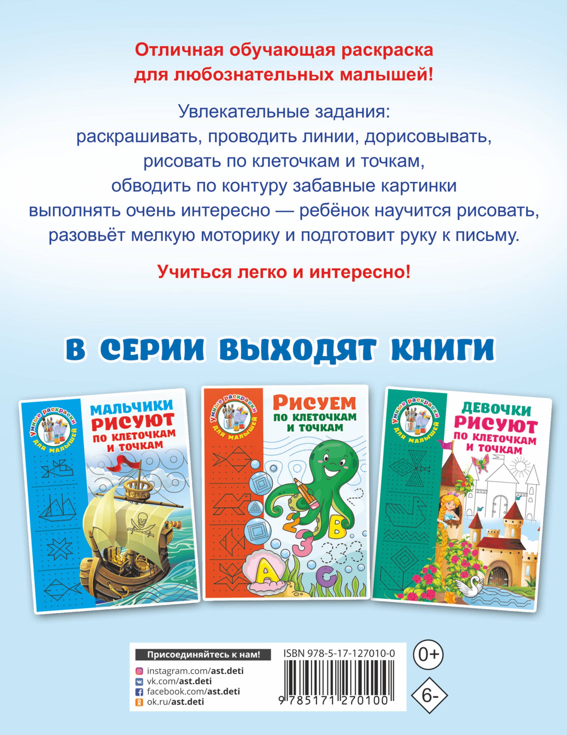 О чем эта книга Эта книга - прекрасный тренажер для развития мелкой моторики, внимания, памяти, мышления и воображения. Кому эта книга будет интересна Книга будет интересна любознательным дошколятам 5-6 лет. В помощь заботливым родителям для подготовки к школе. Особенности этой книги Рисование по клеточкам и точкам - это своего рода игра, которая прекрасно готовит детей к письму. Простые картинки для обводки, штриховки, дорисовки - для развития мелкой моторики и отработки графических навыков. Интересные и увлекательные задания тренируют мышление и интеллект, мелкую моторику, зрительное восприятие и координацию движений руки ребёнка.