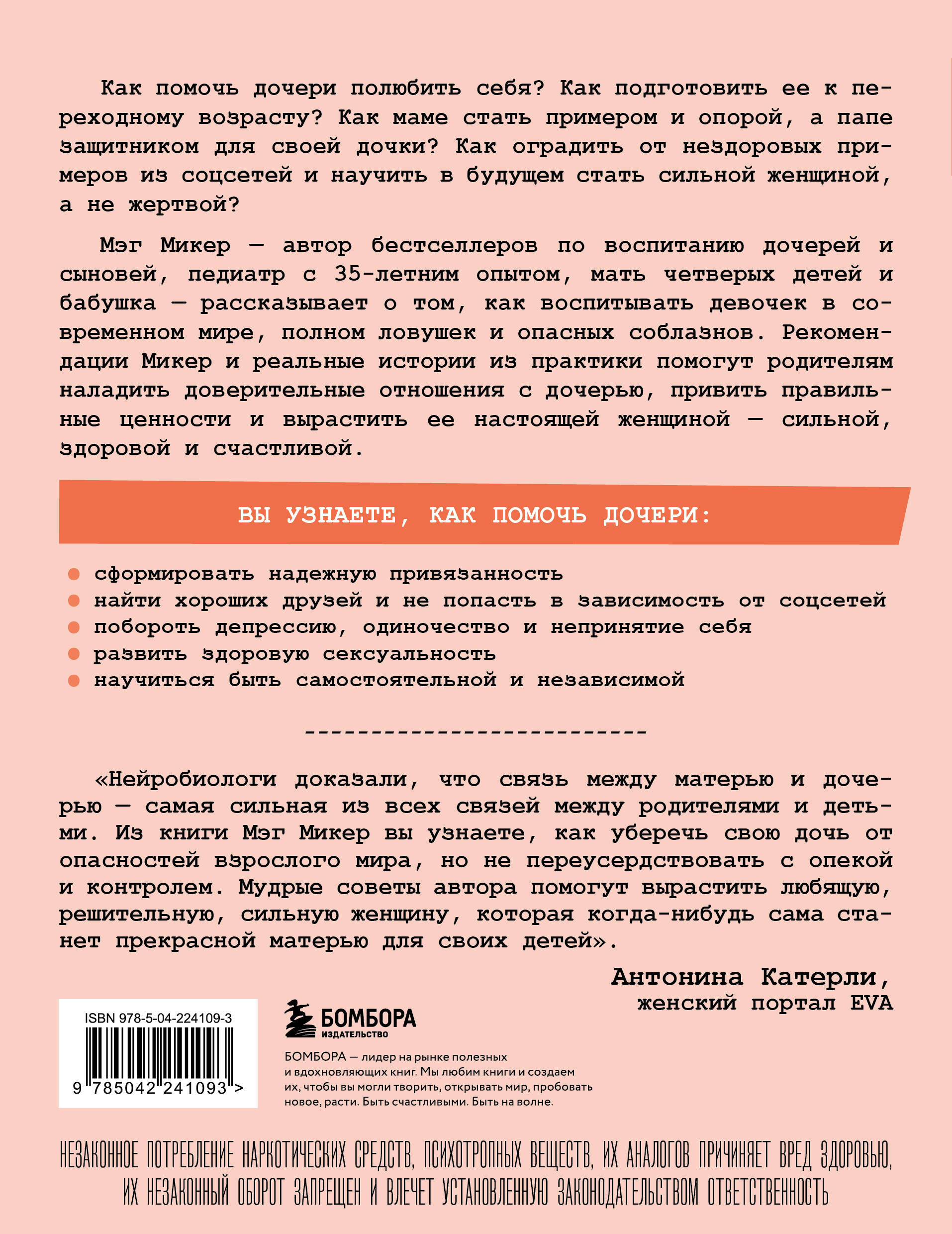 Если у вас дочь, эта книга вам необходима! Как уберечь дочь в современном мире, где много соблазнов и нездоровых примеров? Как стать ей опорой с детства и помочь пережить подростковый возраст, в котором бушуют гормоны и тянет на противоречия? В этой книге Мэг Микер, педиатр с 30-летним опытом, автор бестселлеров, мама и бабушка, рассказывает о том, как уберечь дочь от бед и соблазнов и вырастить ее здоровой и счастливой. Автор предлагает систему воспитания из 11 шагов, которая поможет родителям научиться лучше понимать свою дочь, наладить доверительные отношения и привить ей правильные ценности. Вы узнаете, как помочь дочери сформировать надежную привязанность; найти хороших друзей и не попасть в зависимость от соцсетей; побороть депрессию, одиночество и непринятие себя; развить здоровую сексуальность; научиться быть самостоятельной, а не жертвой. В России уже продано более 150 000 экземпляров книг Мэг Микер «Мама и сын» и 15 000 экземпляров книги «Мама и дочь»! НЕЗАКОННОЕ ПОТРЕБЛЕНИЕ НАРКОТИЧЕСКИХ СРЕДСТВ, ПСИХОТРОПНЫХ ВЕЩЕСТВ, ИХ АНАЛОГОВ ПРИЧИНЯЕТ ВРЕД ЗДОРОВЬЮ, ИХ НЕЗАКОННЫЙ ОБОРОТ ЗАПРЕЩЕН И ВЛЕЧЕТ УСТАНОВЛЕННУЮ ЗАКОНОДАТЕЛЬСТВОМ ОТВЕТСТВЕННОСТЬ.| Издательство | ООО "Издательство "Эксмо" |
