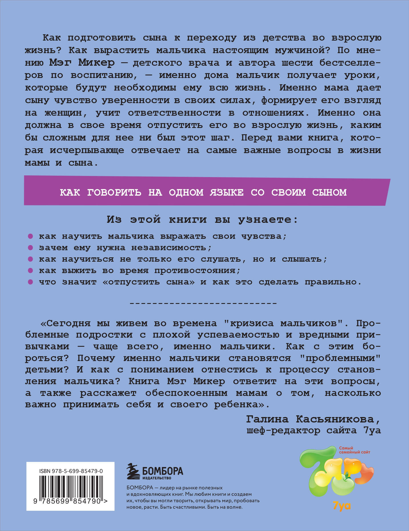 В РОССИИ ПРОДАНО БОЛЕЕ 120 000 ЭКЗЕМПЛЯРОВ! Книга делает акцент на самых главных вопросах в жизни мамы и сына. Любовь и поддержка, забота и независимость, противостояния и конфликты - всем этим темам уделено самое пристальное внимание. Отдельно автор говорит о том, как включить отца в воспитательный процесс, как уберечь подростка от опасностей, связанных с сексом, как обеспечить ребенку мужское внимание, если он растет без отца. Доверительная интонация Мэг Микер располагает читателя к автору, а множество примеров из жизни помогает лучше усвоить полезные и мудрые советы. Об авторе Мэг Микер - детский врач, мама и автор шести бестселлеров по воспитанию, среди которых известная книга «Папа и дочь. Секреты воспитания девочек, которые должен знать каждый отец». Из этой книги вы узнаете: - Как говорить на одном языке со своим сыном. - Как научить мальчика выражать свои чувства. - Зачем ему нужна независимость. - Как научиться не только его слушать, но и слышать. - Как выжить во время противостояния. - Что значит «отпустить сына» и как это сделать правильно.