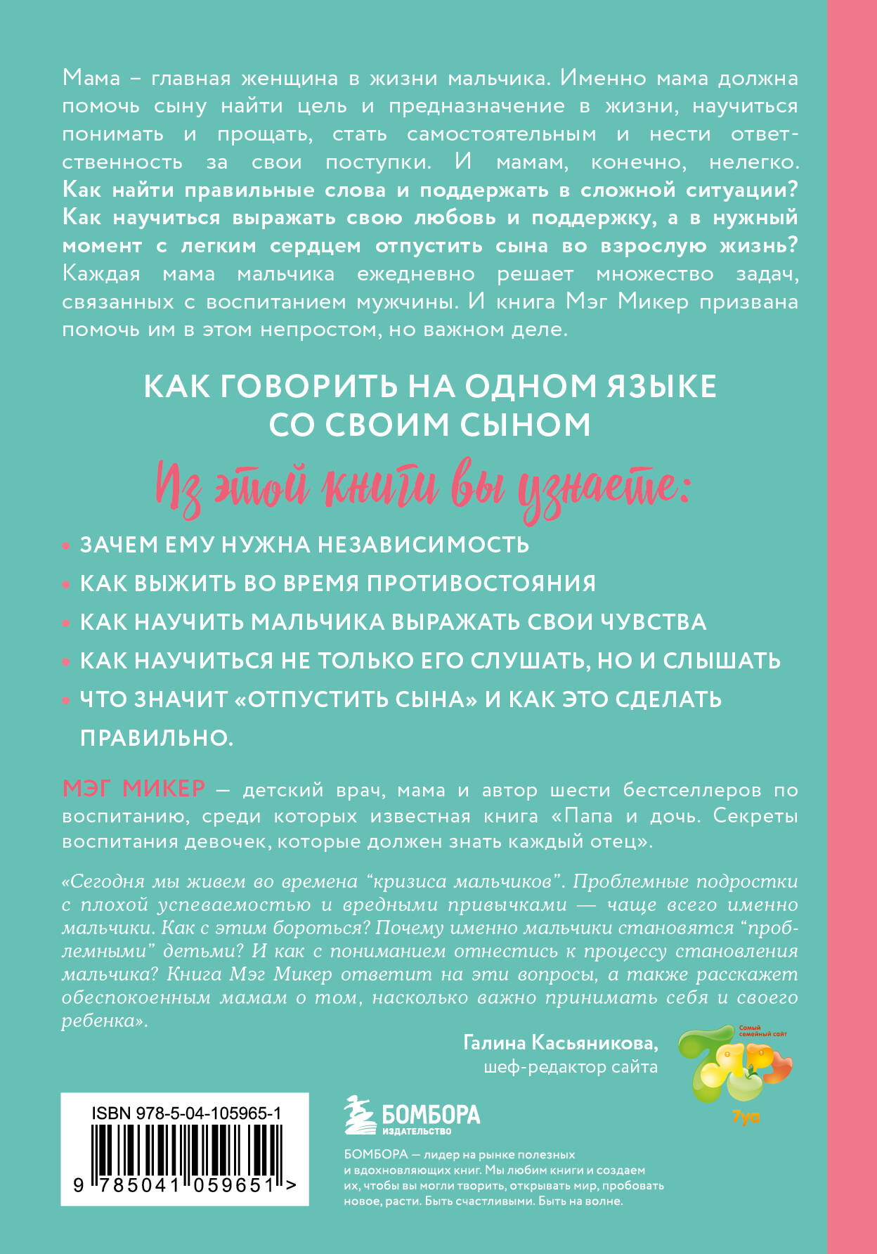 В РОССИИ ПРОДАНО БОЛЕЕ 120 000 ЭКЗЕМПЛЯРОВ! Книга делает акцент на самых главных вопросах в жизни мамы и сына. Любовь и поддержка, забота и независимость, противостояния и конфликты - всем этим темам уделено самое пристальное внимание. Отдельно автор говорит о том, как включить отца в воспитательный процесс, как уберечь подростка от опасностей, связанных с сексом, как обеспечить ребенку мужское внимание, если он растет без отца. Доверительная интонация Мэг Микер располагает читателя к автору, а множество примеров из жизни помогает лучше усвоить полезные и мудрые советы. Об авторе Мэг Микер - детский врач, мама и автор шести бестселлеров по воспитанию, среди которых известная книга «Папа и дочь. Секреты воспитания девочек, которые должен знать каждый отец». Из этой книги вы узнаете: - Как говорить на одном языке со своим сыном. - Как научить мальчика выражать свои чувства. - Зачем ему нужна независимость. - Как научиться не только его слушать, но и слышать. - Как выжить во время противостояния. - Что значит «отпустить сына» и как это сделать правильно.| Издательство | ООО "Издательство "Эксмо" |