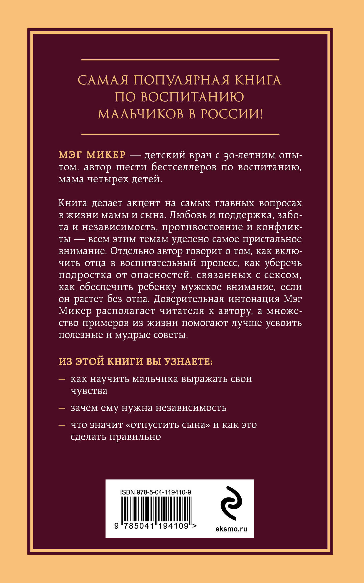 АБСОЛЮТНЫЙ БЕСТСЕЛЛЕР В РОССИИ! ПРОДАНО БОЛЕЕ 120 000 ЭКЗЕМПЛЯРОВ! «Главные книги жизни» - это лучшие книги по психологии и саморазвитию, которые признал весь мир и успели оценить десятки и сотни тысяч читателей в России. Вдохновляйтесь, меняйтесь, действуйте - вы на верном пути! Ведь книги, как и люди, приходят в нашу жизнь не случайно! Книга делает акцент на самых главных вопросах в жизни мамы и сына. Любовь и поддержка, забота и независимость, противостояния и конфликты - всем этим темам уделено самое пристальное внимание. Отдельно автор говорит о том, как включить отца в воспитательный процесс, как уберечь подростка от опасностей, связанных с сексом, как обеспечить ребенку мужское внимание, если он растет без отца. Доверительная интонация Мэг Микер располагает читателя к автору, а множество примеров из жизни помогает лучше усвоить полезные и мудрые советы. Об авторе Мэг Микер - детский врач, мама и автор шести бестселлеров по воспитанию, среди которых известная книга «Папа и дочь. Секреты воспитания девочек, которые должен знать каждый отец». Из этой книги вы узнаете: - Как говорить на одном языке со своим сыном. - Как научить мальчика выражать свои чувства. - Зачем ему нужна независимость. - Как научиться не только его слушать, но и слышать. - Как выжить во время противостояния. - Что значит «отпустить сына» и как это сделать правильно.| Издательство | ООО "Издательство "Эксмо" |